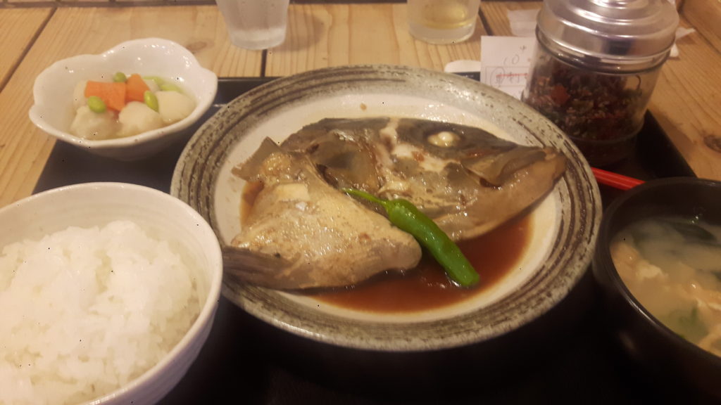 煮つけを食べたく、カンパチのカマの煮つけ定食(1380円)を頼む。少し時間がかかるというので刺身盛り合わせ(1430円)をとり、ビール(内緒)。