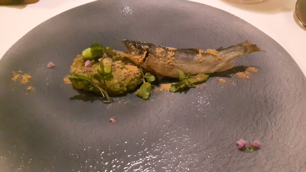 アユのコンフィ+クレソンのリゾットには、アンチョビや花穂紫蘇などのアクセントでイタリアンとしては未知の味といえます。
