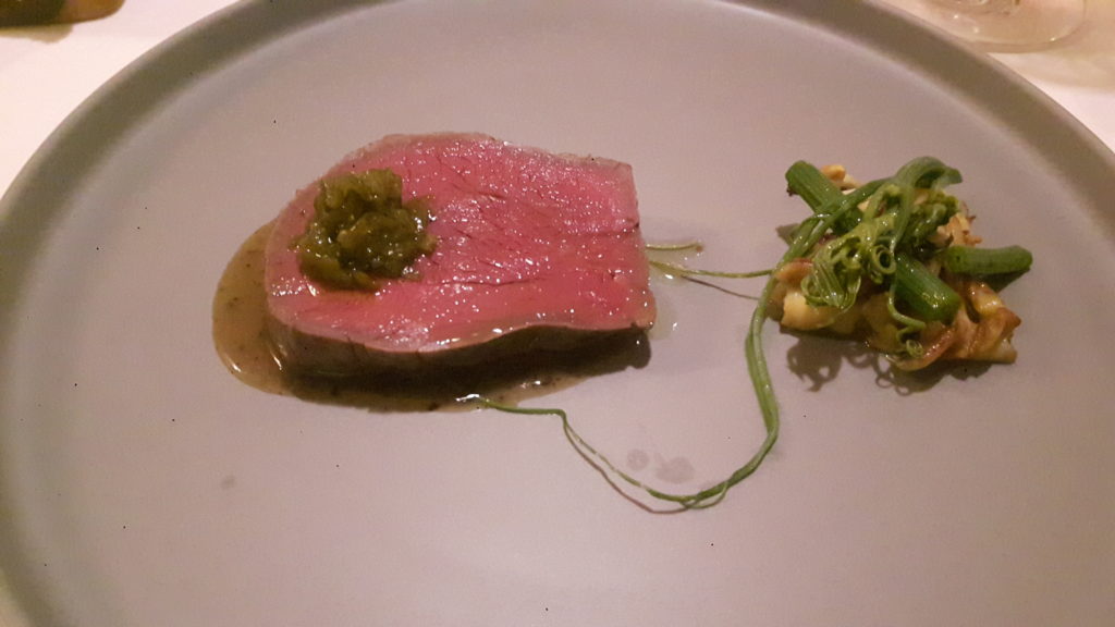 メインの夏鹿のローストは柔らかく、レバー風味がよいのですが、キハダの実のソースは苦味や独特のスパイス感、さらに伏見唐辛子もあわさり、インパクトがありました。