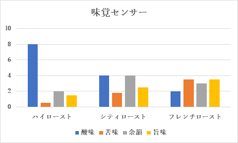 この参加会社の試飲コーヒーを、インテリジェントセンサーテクノロジー社が味覚センサーでグラフ化しています。