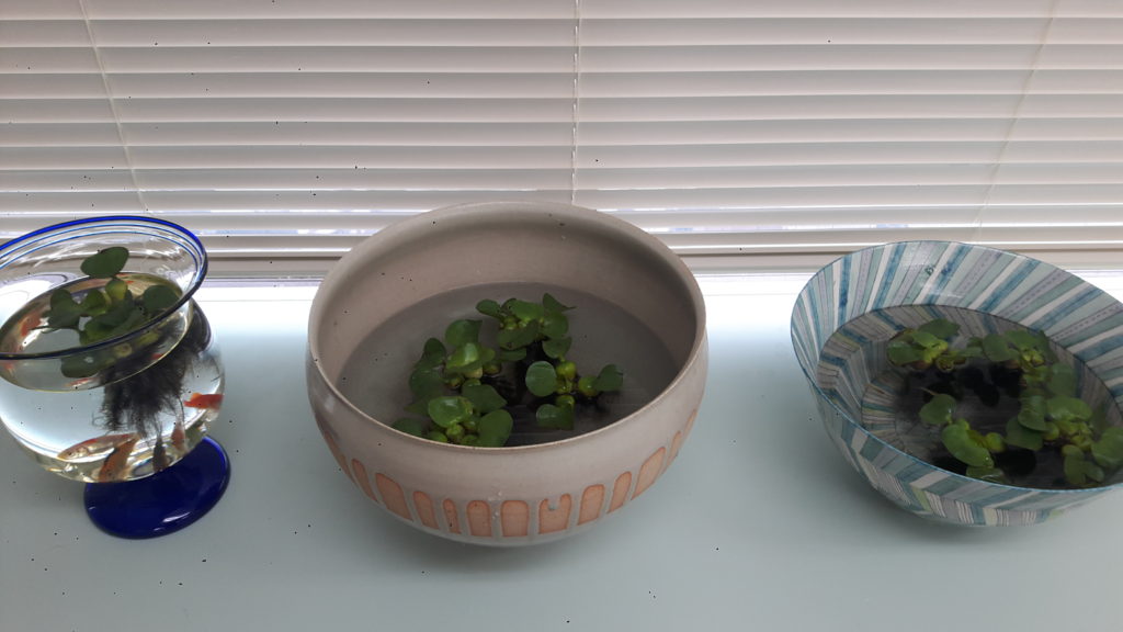 以前、陶芸作家に作ってもらった睡蓮鉢があり、研究所でメダカを飼うことにしました。(世田谷店のトイレにも睡蓮鉢があり、20年前から金魚が泳いでいるのをご存じのお客様も多いと思います)