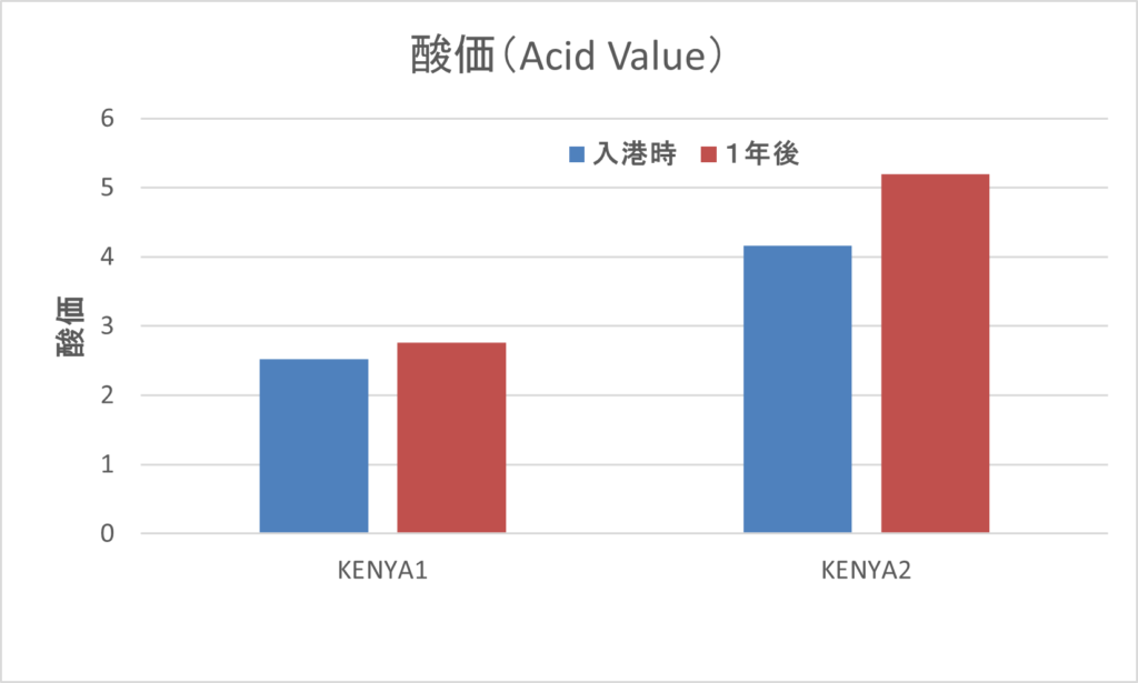 グラフは脂質の劣化(酸価・数値が少ない方がよい)を見ていますが、1はリーファーコンテナ(15℃)で真空パック、2はドライコンテナ(常温)で麻袋で輸入したものです。