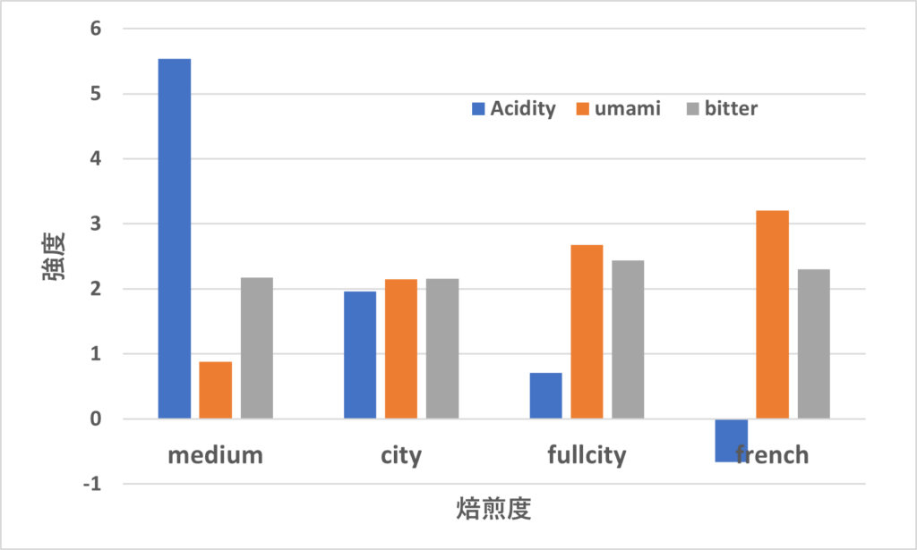 焙煎度の浅い方が酸味が強いことがわかります。それに反比例するかのように旨味は増加しています。