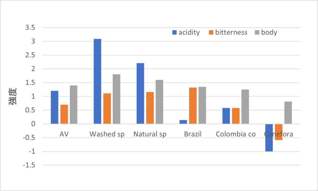 表の左は5つの試料のアベレージ。ここで単純にわかることは、SPのWashedの酸味が強く、次にSPのNatural、ブラジルは酸味が弱い、カネフォーラはさらに酸味がない。