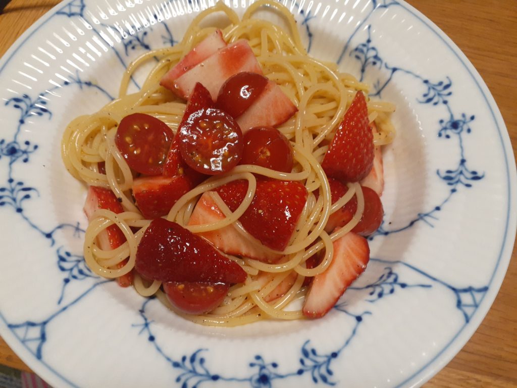 夜はプチトマトとイチゴ(とちおとめ)のスパゲティ