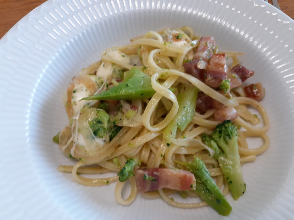 パンチエッタを炒め、そこにフィットチーネとブロッコリを入れ、