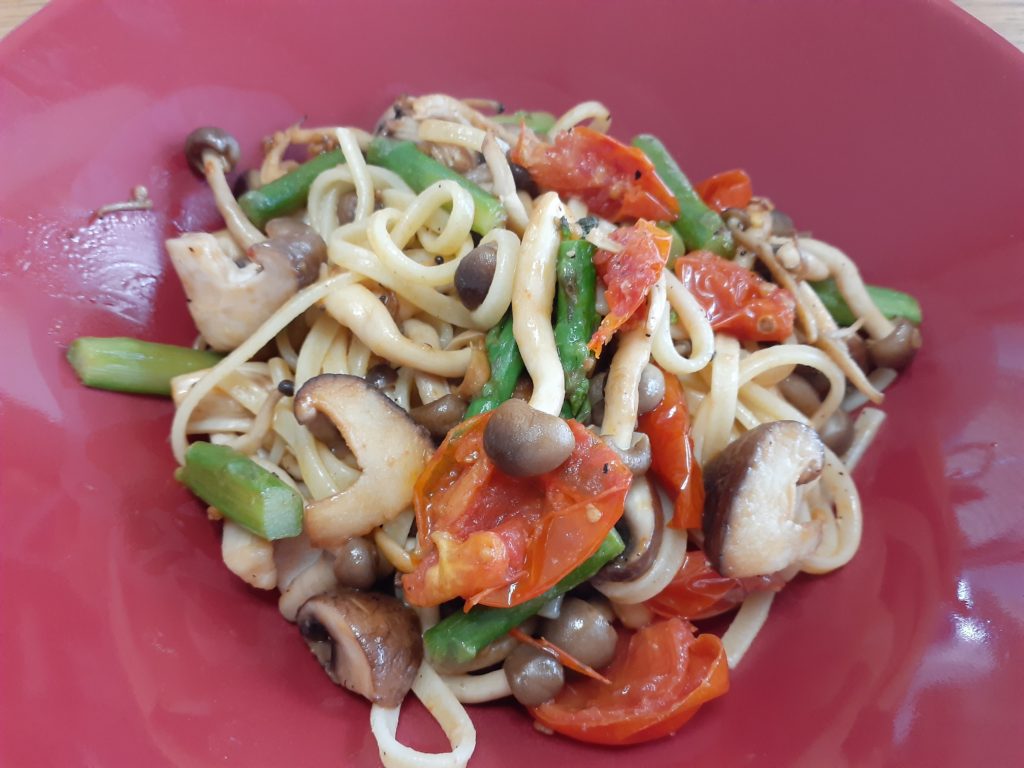しめじ、シイタケ、軽くゆでたアスパラを炒め、セミドライトマトを加える。