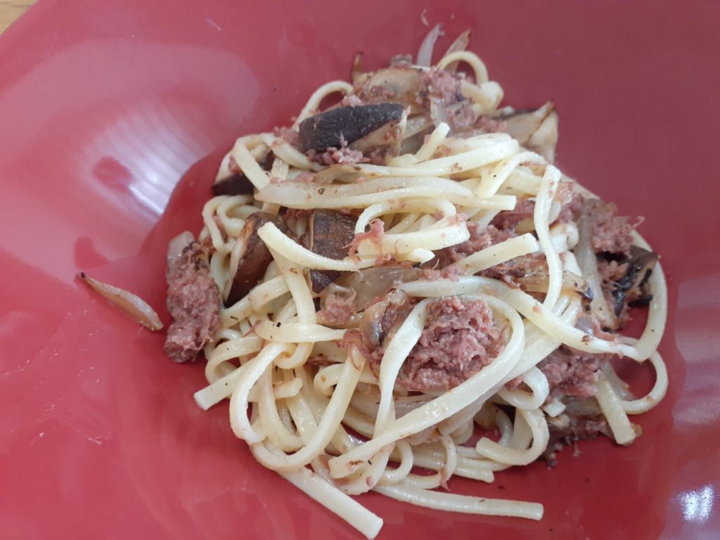 急にコンビーフが食べたくなり、何十年ぶりか?ノザキのオージー産を買いました。冷蔵庫を物色し、新玉ねぎ、シイタケを炒め、コンビーフの缶詰から40gを入れる。茹でたフィットチーネ35gを入れ(デルベルデが以外にもおいしい)塩コショウ、これだけだと味がまとまらないので全卵を入れさらに軽く加熱しつつあえる。まだ一味足りないかな。