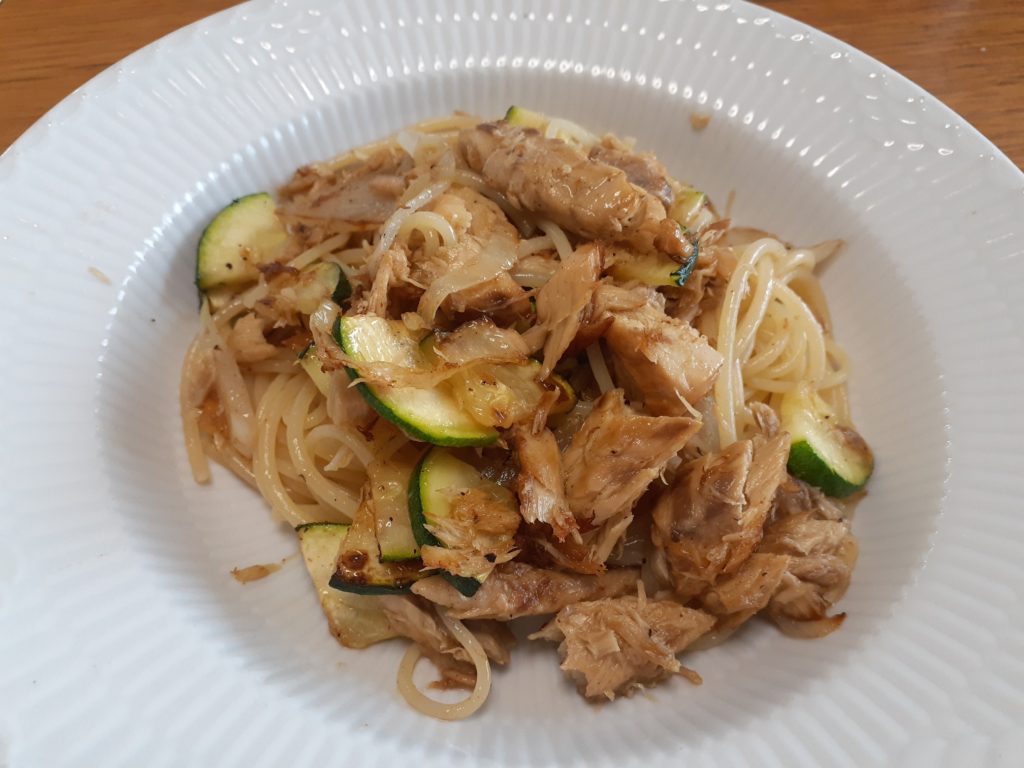 今、絶好調の食品宅配大手のオイシックスの、ノルウエー産のサバのフィレ缶詰めがあったので、新潟の新タマネギ、ズッキーニをバターで炒め、サバを入れ、さらにスパゲティ。どうも女性は、オイシックスのミールキッドがお好きなようです。