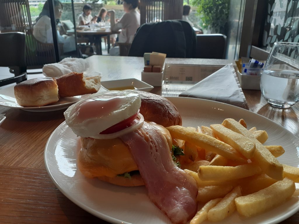 ハンバーガーにフレンチポテトがついているのに、ビールが飲めないのはさみしい限りです。ちなみにハンバーガーにベーコン、チーズ、目玉焼きが挟まれていましたが、ベーコンとチーズの強い味が肉の味を損ねているように感じました。