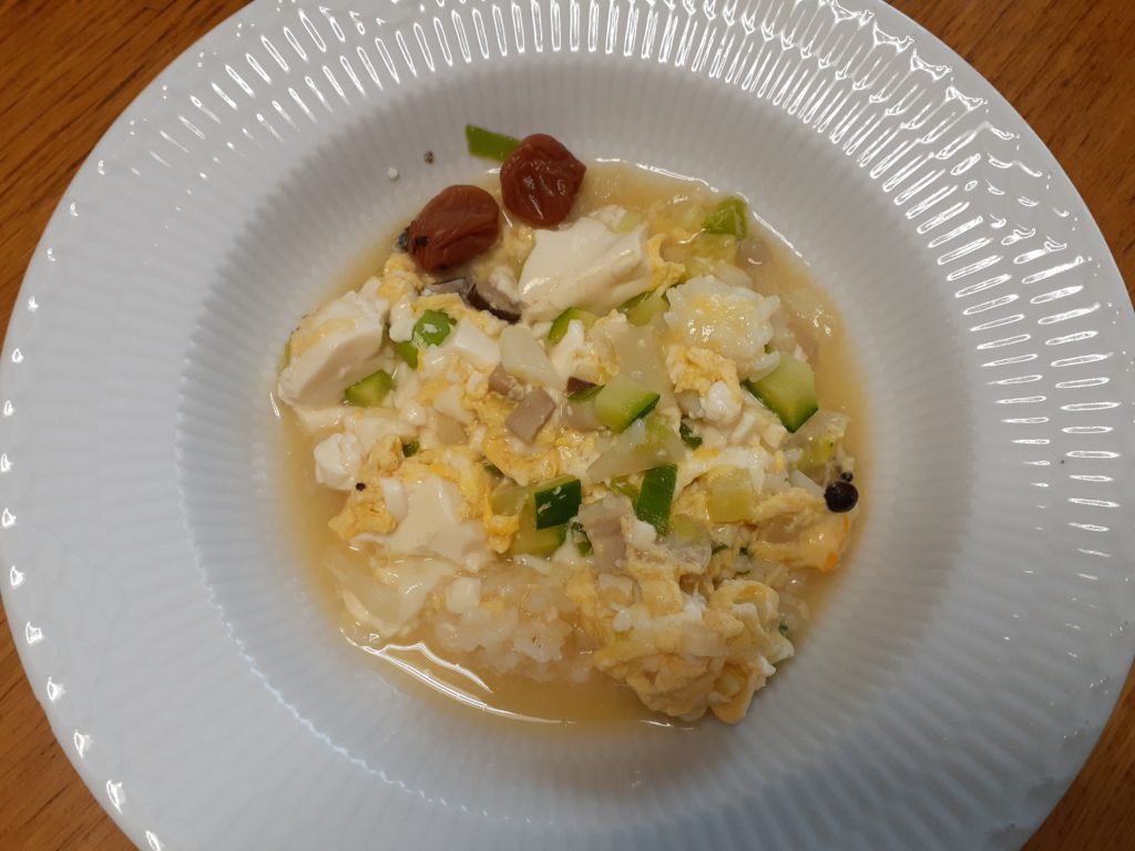 夕食は雑炊。おじやと何が違うのはよくわかりませんが、カブ、ズッキーニ、ネギ、しめじ、豆腐、卵を入れたもの。