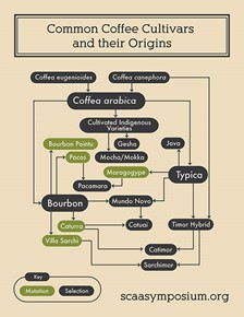 図は、最も一般的なコーヒーの品種間の関係を表しています。植物グループを結ぶ線と矢印は、親子関係を示します。薄い色は、自発的な遺伝的変化に起因(突然変異)する品種です。