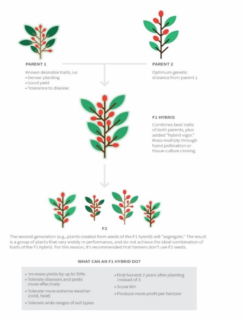 カスティージョ種の場合、品種改良時のF1は樹高が低くさび病に強いものでしたが、その後のF2は樹高がばらつき、耐病性のバラツキも見られたようです。つまり遺伝的に安定しません。したがって、最終的には、さび病に耐性のある矮小種を選びつつ、別々の場所で最良の子孫を繁殖させながらF5まで交雑、生育させています。