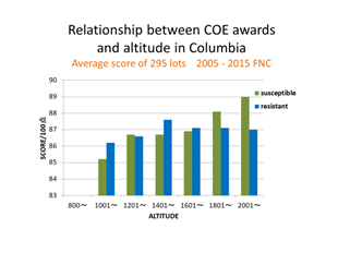 グラフは、COEオークションの入賞豆をグラフにしたものです。Susceptibleは、標高が高くなるにつれ官能評価スコアが高くなり、相関性がみられますが、Resistaentは、1401mから1600mが最も評価が高くなり標高との相関はみられません。この 結果からは、在来種系の方が高標高で風味のよいコーヒーが生まれる可能性が高いと考えられます。