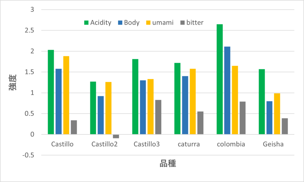 また、カスティージョ種とカトゥーラ種が同じ風味パターンを示すこともあり、コロンビアコーヒーの風味評価は難しいといえます。この試料では、Castillo1とCaturra2が、Castillo2とCaturra1が同じ風味特性を示しています。