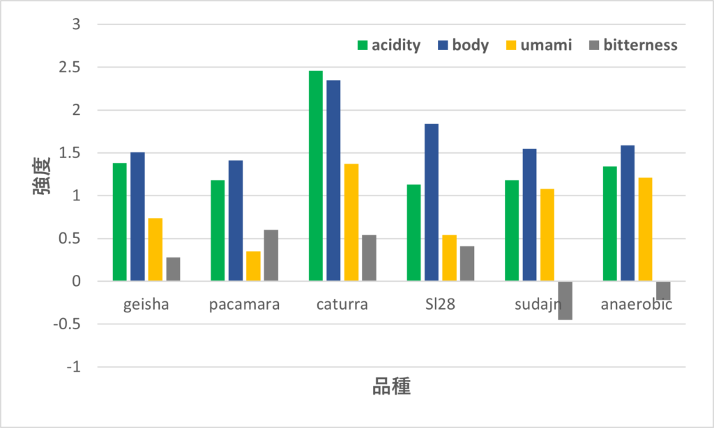 グラフは、グァテマラの某農園のプライベートオークションの品種別のコーヒー2021-21Crop の一部を味覚センサーにかけた結果です。
