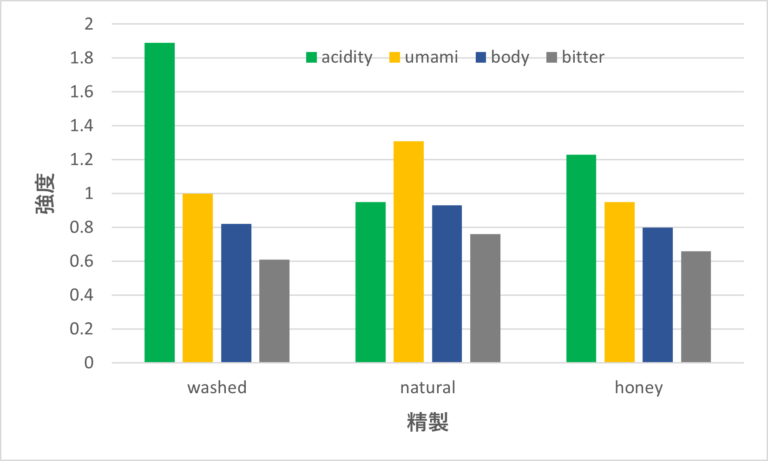 グラフは、エチオピアのゲイシャ種の精製方法別の味覚センサーの結果です。この試料の場合は、Washedは酸味が強く、Naturalはボディ、旨味、苦味がややあり、Pulped Naturalはその中間ときれいなパターンが見られます。