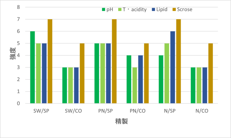 SPとCOの差異であれば官能評価及び理化学的な数値に多少差異が出ます。しかし、SP同士の場合は、官能評価および成分の差異はでにくく、風味のパターンや統一性ははっきりとは見られませんので、それらの相関研究は難しいと感じています。