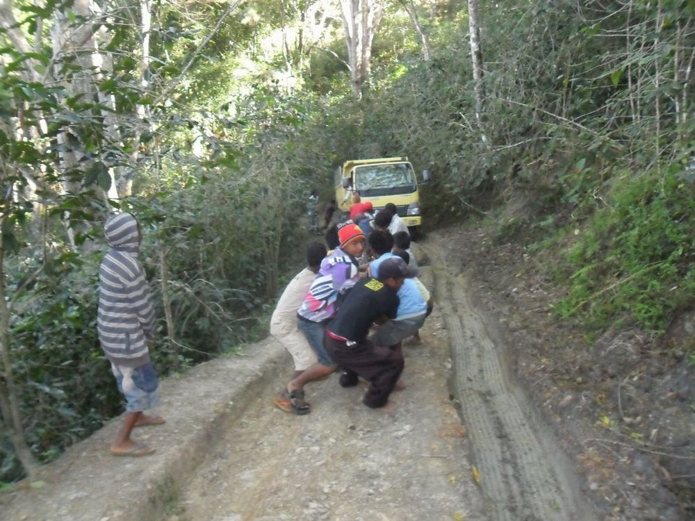 写真右は溝にタイヤがはまってしまった車。道は険しいですよ。
