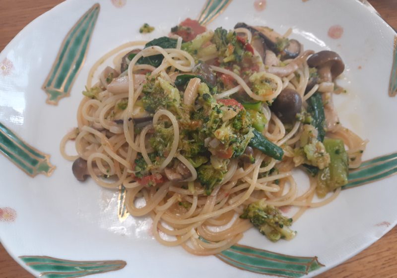 ブロッコリとしめじとプチトマト(めんどうですが湯むきします、リコピンがどうのとか言わないで)のスパゲティで、あと野菜は何でOK.ですが、これはグダグダになったブロッコリが主役です。
