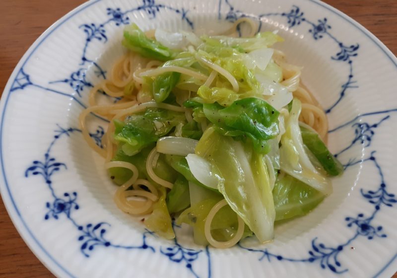 ニンニクと玉ねぎを炒め、パスタ40gを茹で、茹で上がり2~分前くらいにキャベツをどっさり入れます。