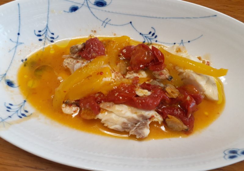 鯛の切り身をオリーブオイルで軽く炒め、水、アサリ、プチトマト、パプリカ(余っていたから)を入れて煮込むだけです。