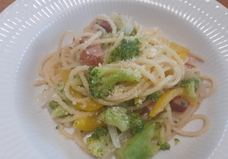 このスパゲティに、ブロッコリ、パプリカを加えたものです。ブロッコリは、パスタといっしよに茹でます。