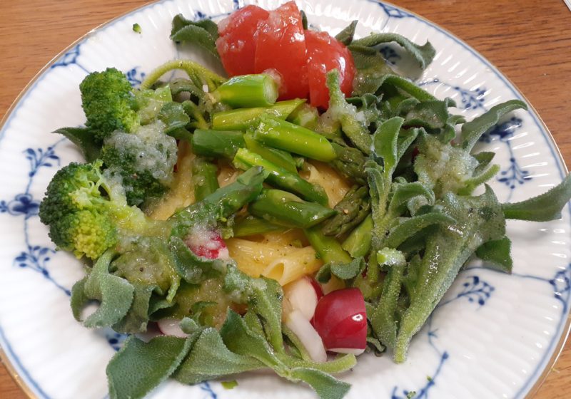 ショートパスタ30gを茹で。アスパラ3本とブロコリを蒸し器で蒸します。