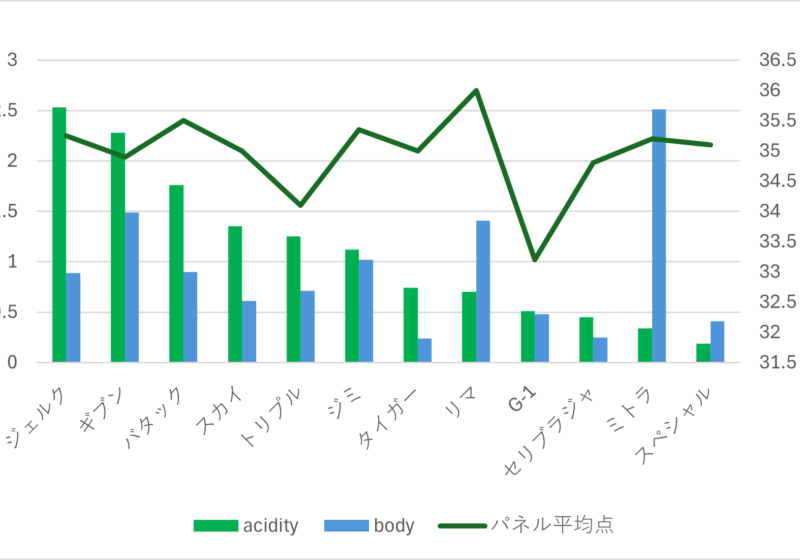 酸味が強い豆も含まれていますが、柑橘果実のクエン酸の穏やかな酸ではなく、酢酸やピルビン酸などの酸っぱい酸に近いと感じます。