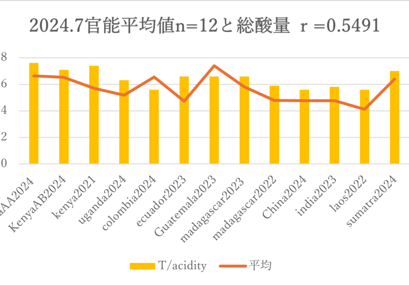 相関係数が高ければ、官能評価を総酸量が補完しうると考えられ、また総酸量の多い方が官能評価が高くなるとも考えられます。