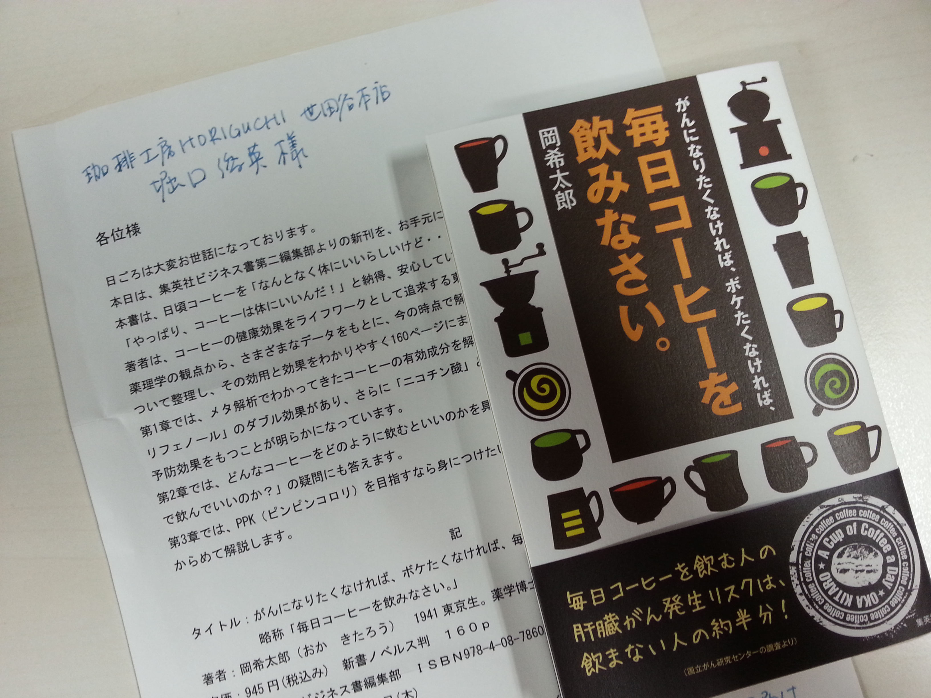 パパ日記 毎日コーヒー 2013.11.20 日記 このブログを読まれる方は毎日コーヒーを飲んでいることと思います。 岡先生(薬学)から新刊「毎日コーヒーを飲みなさい」が送られてきました。 カテゴリ内の一覧をみる