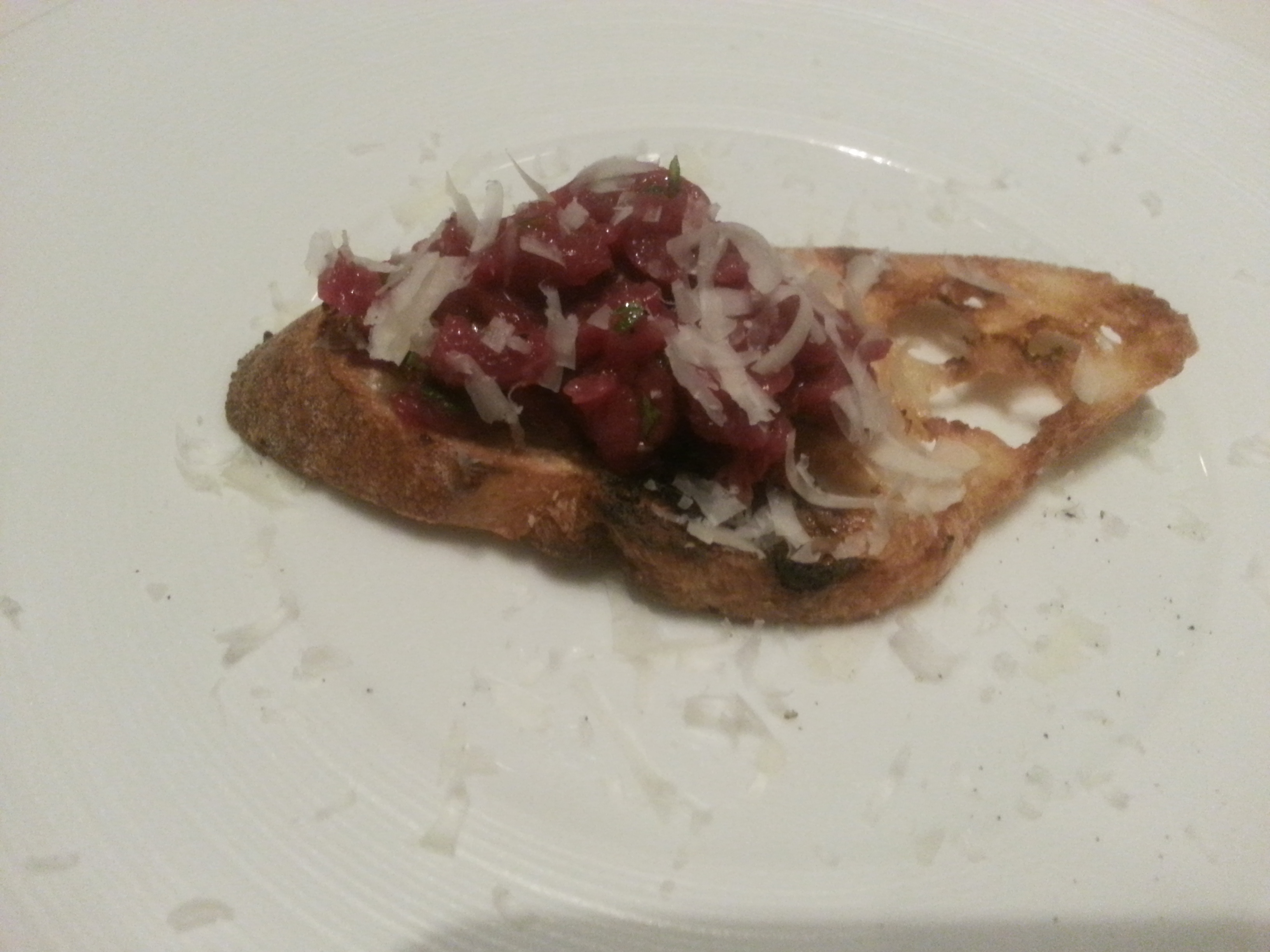 馬肉のカルパッチョ、アナゴのフリット、魚、菜の花のスパゲティ、手打ちショートパスタ、牛肉。