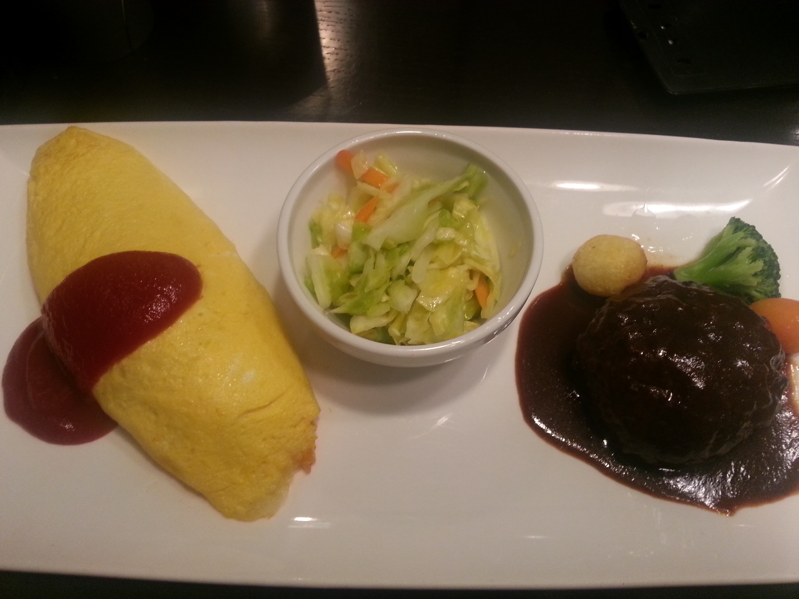 オムライスだけですと途中で飽きてしまいますので、コールスローとハンバーグつき。