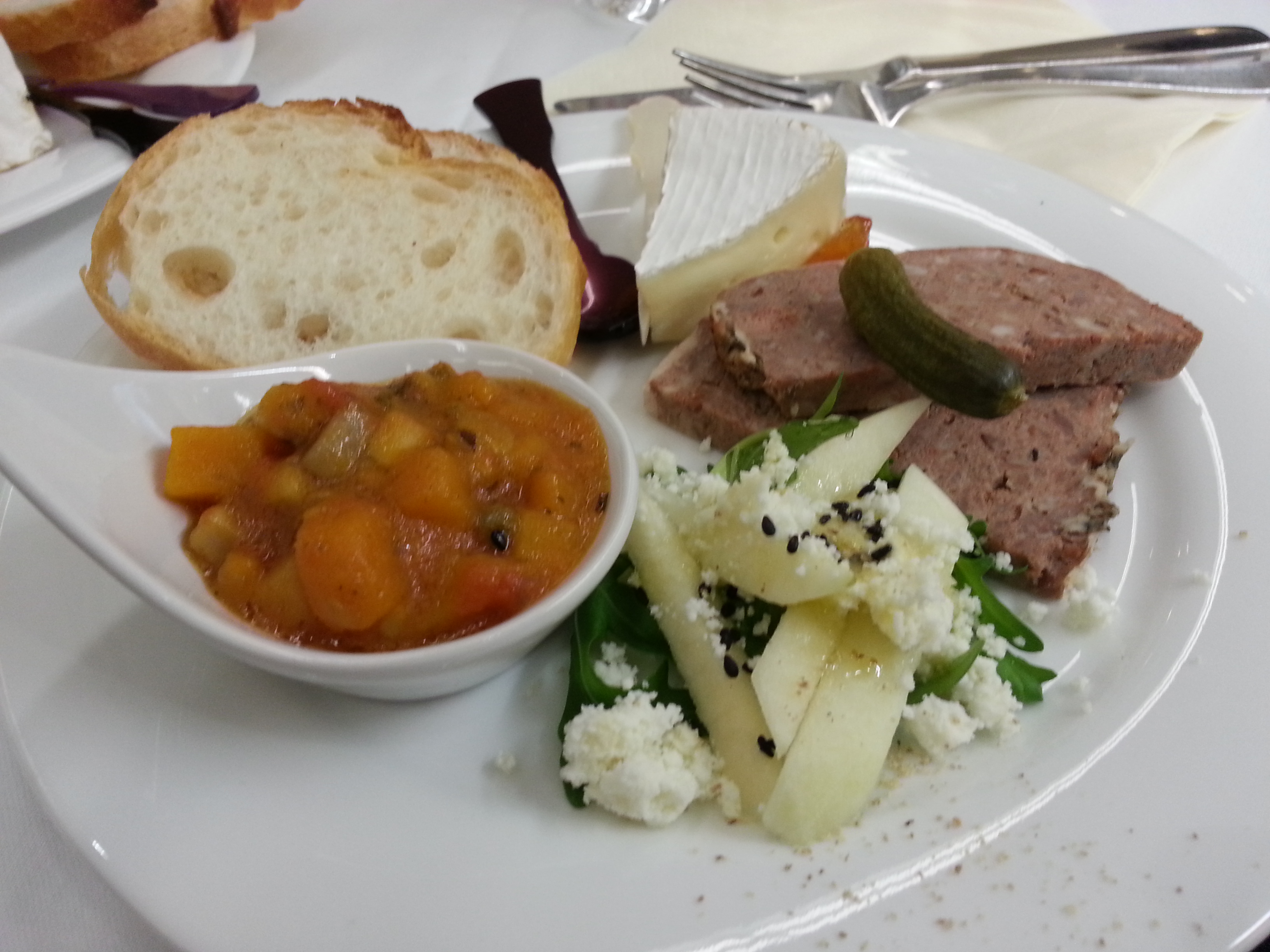 左の黄色のものは、バターを焦がし(ノワゼット・薄い焦げ色)、マッシュルーム、カボチャ、トマトなどを入れて簡単に炒めたもの。バターを使用した前菜でフランスパンにのせ食べれる。