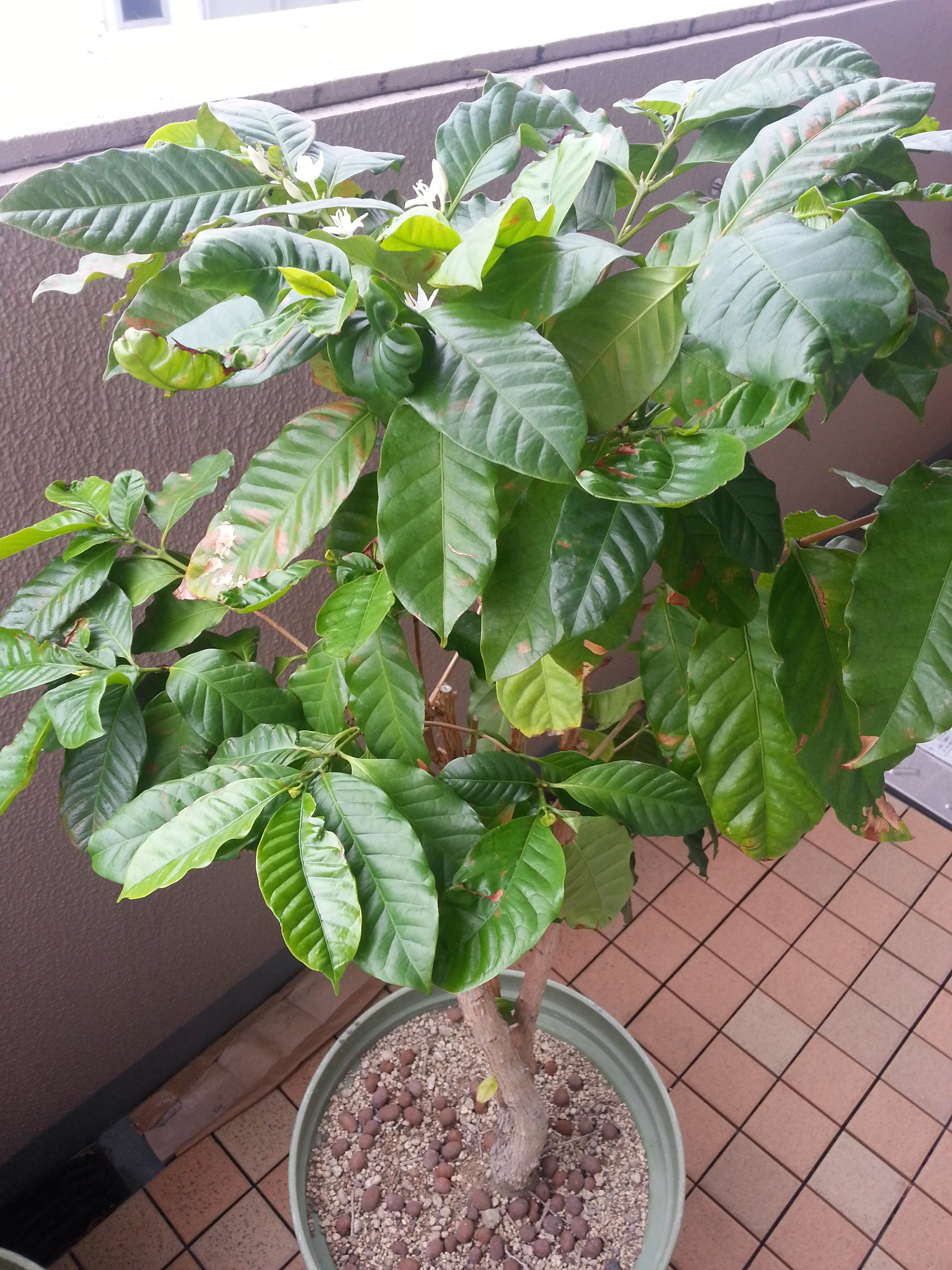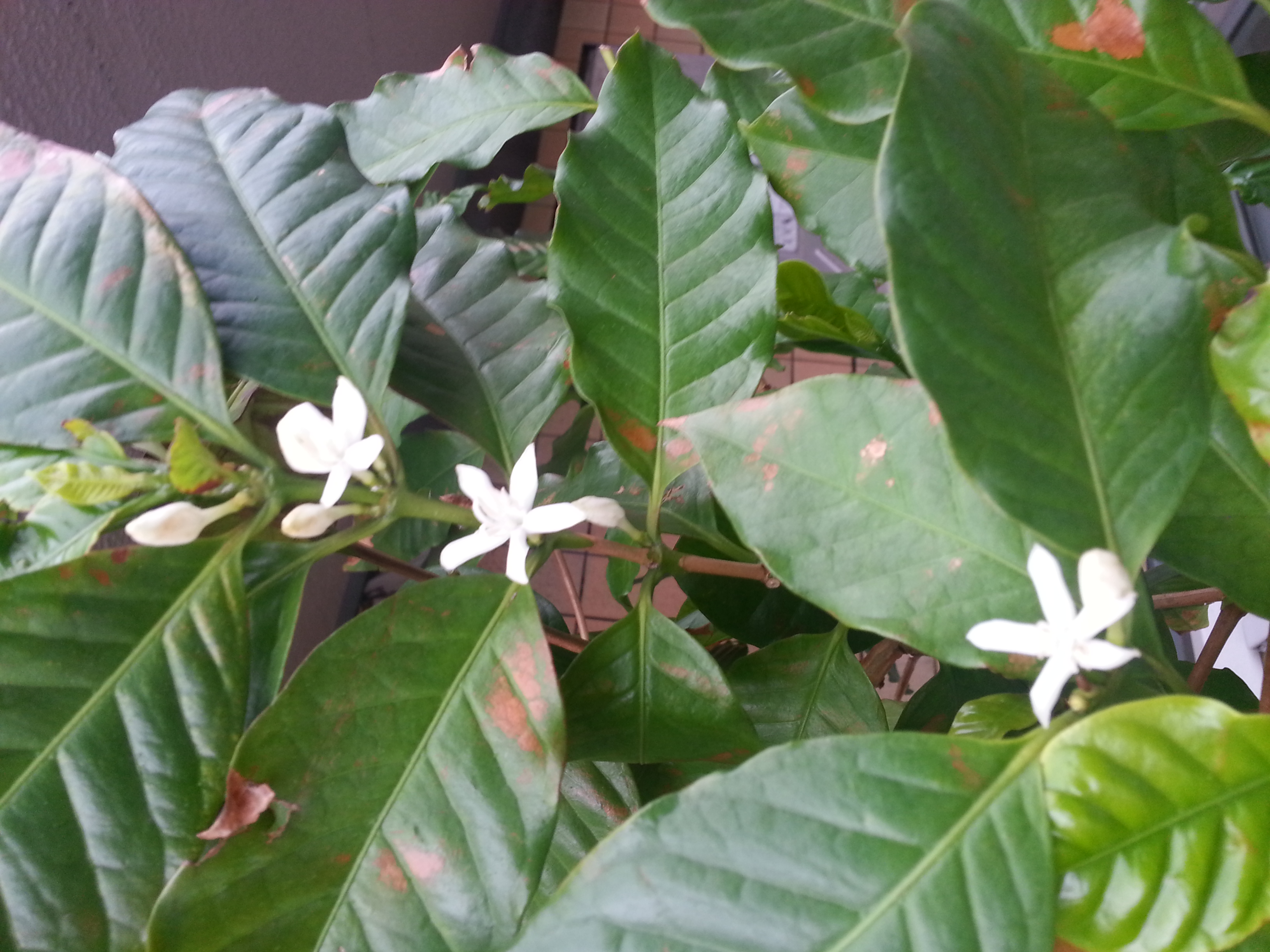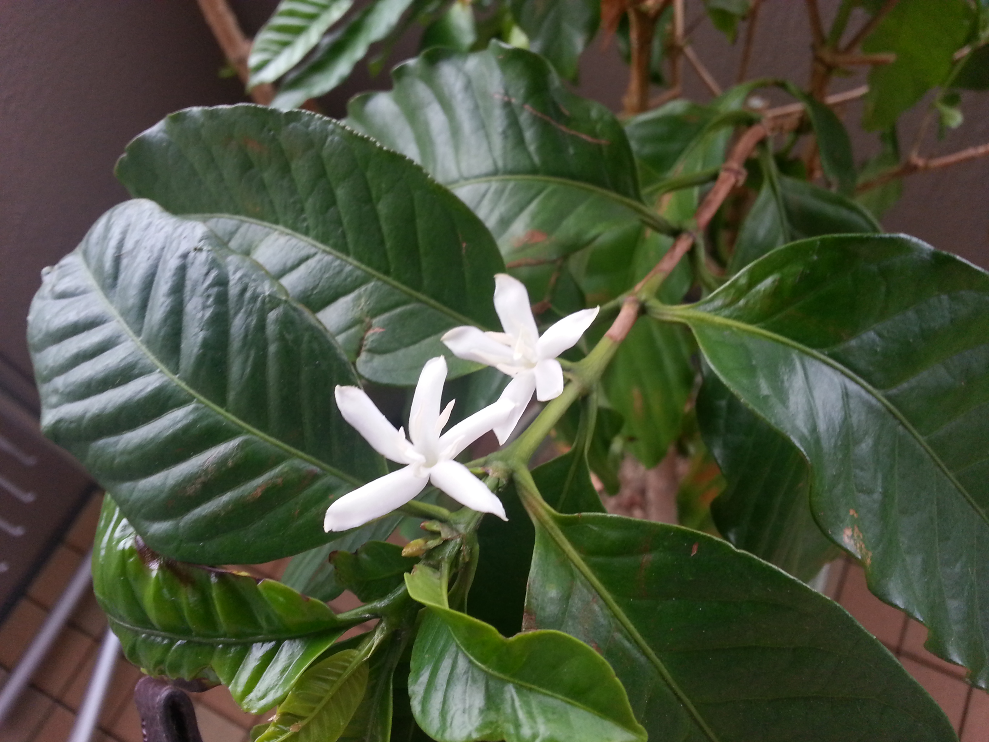 ベランダの鉢植えコーヒーに花が咲きました。