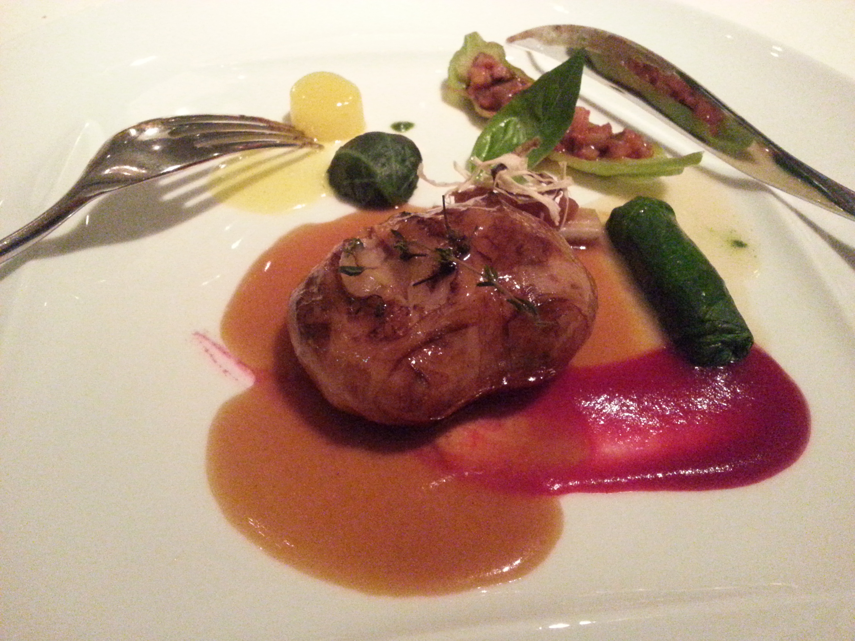 うにと網脂で包んだ仔牛など計4品とチーズ、デザート。