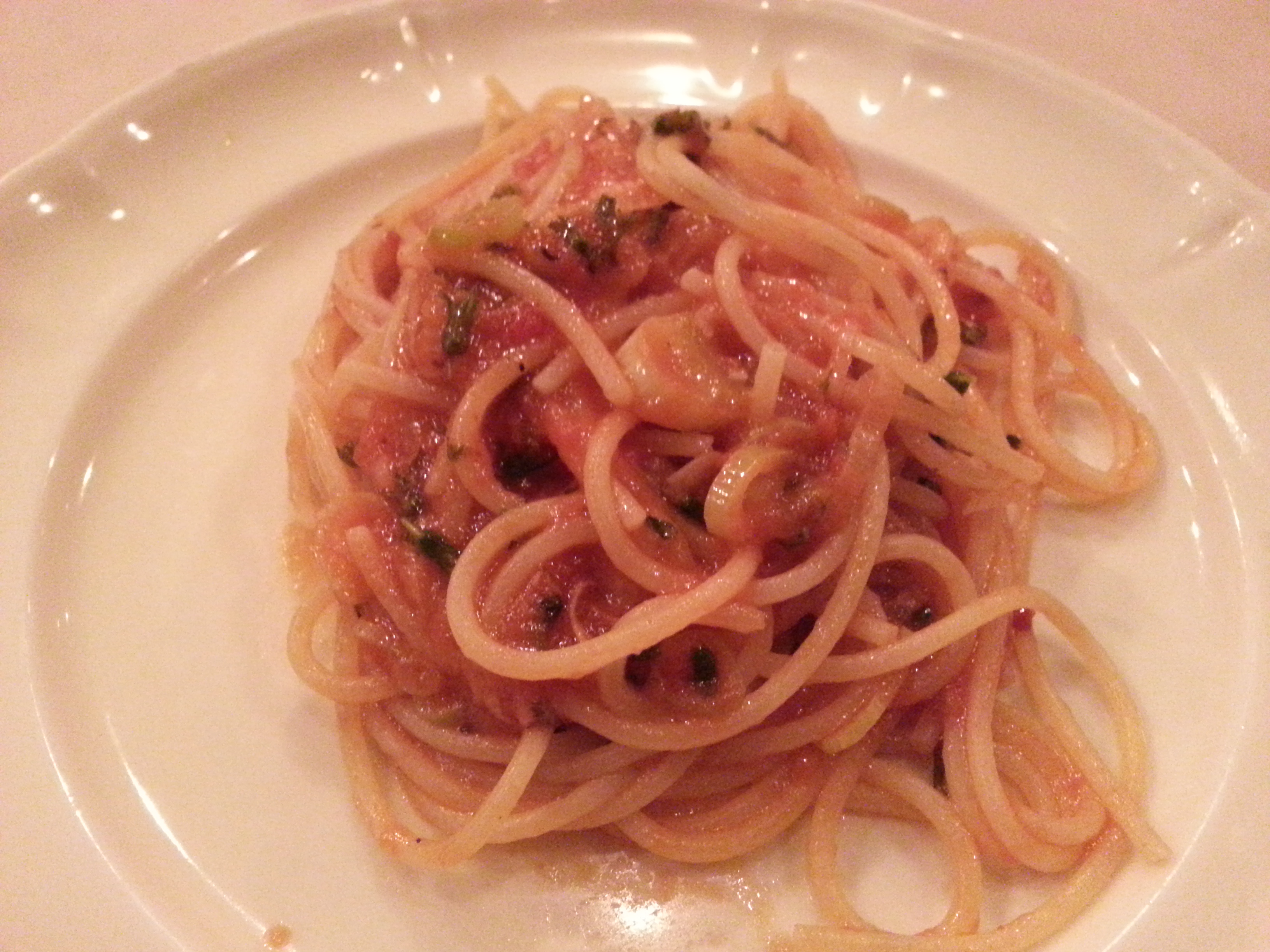 最後にねぎと生姜としその実のトマトソーススパゲティ。