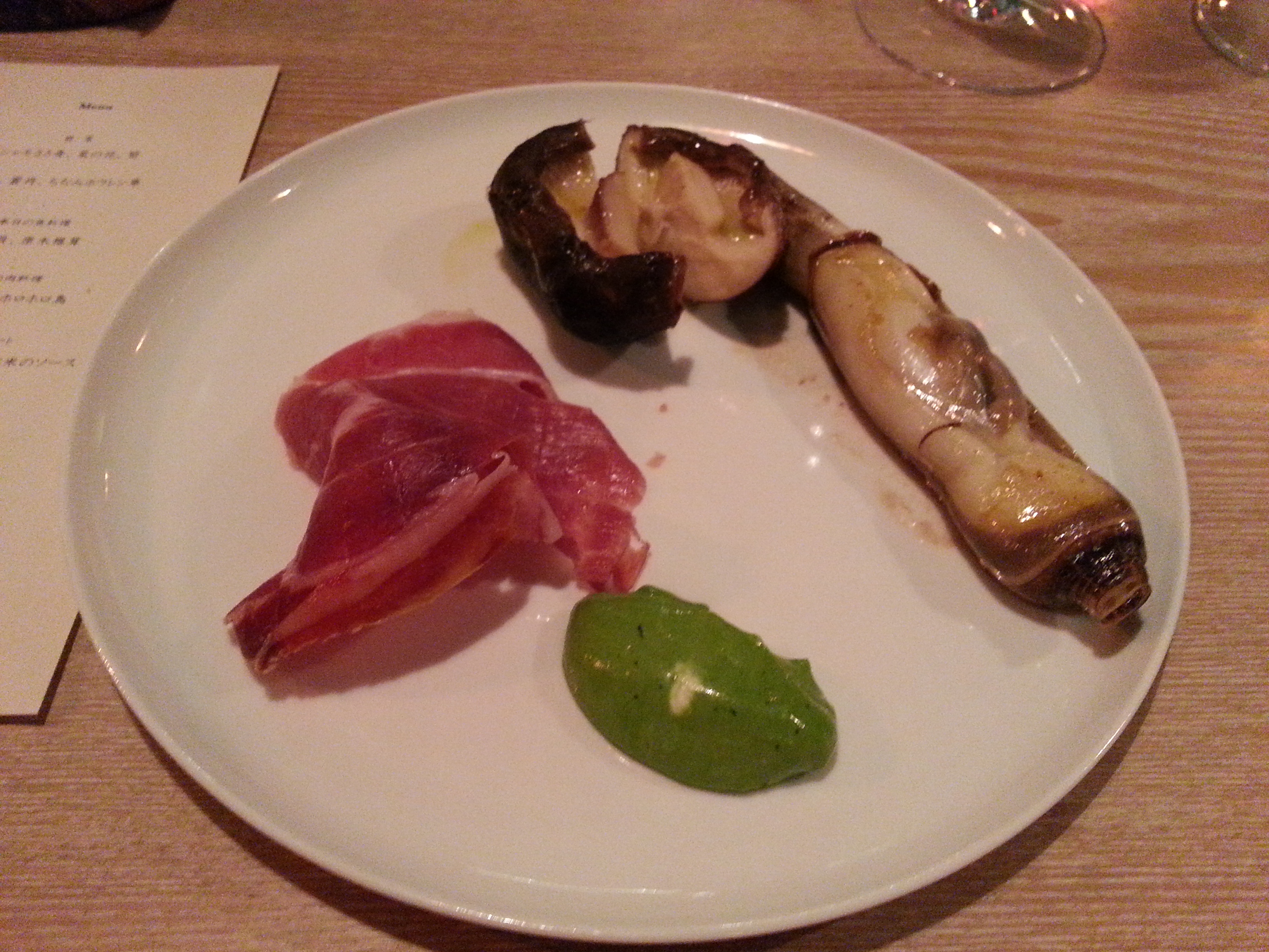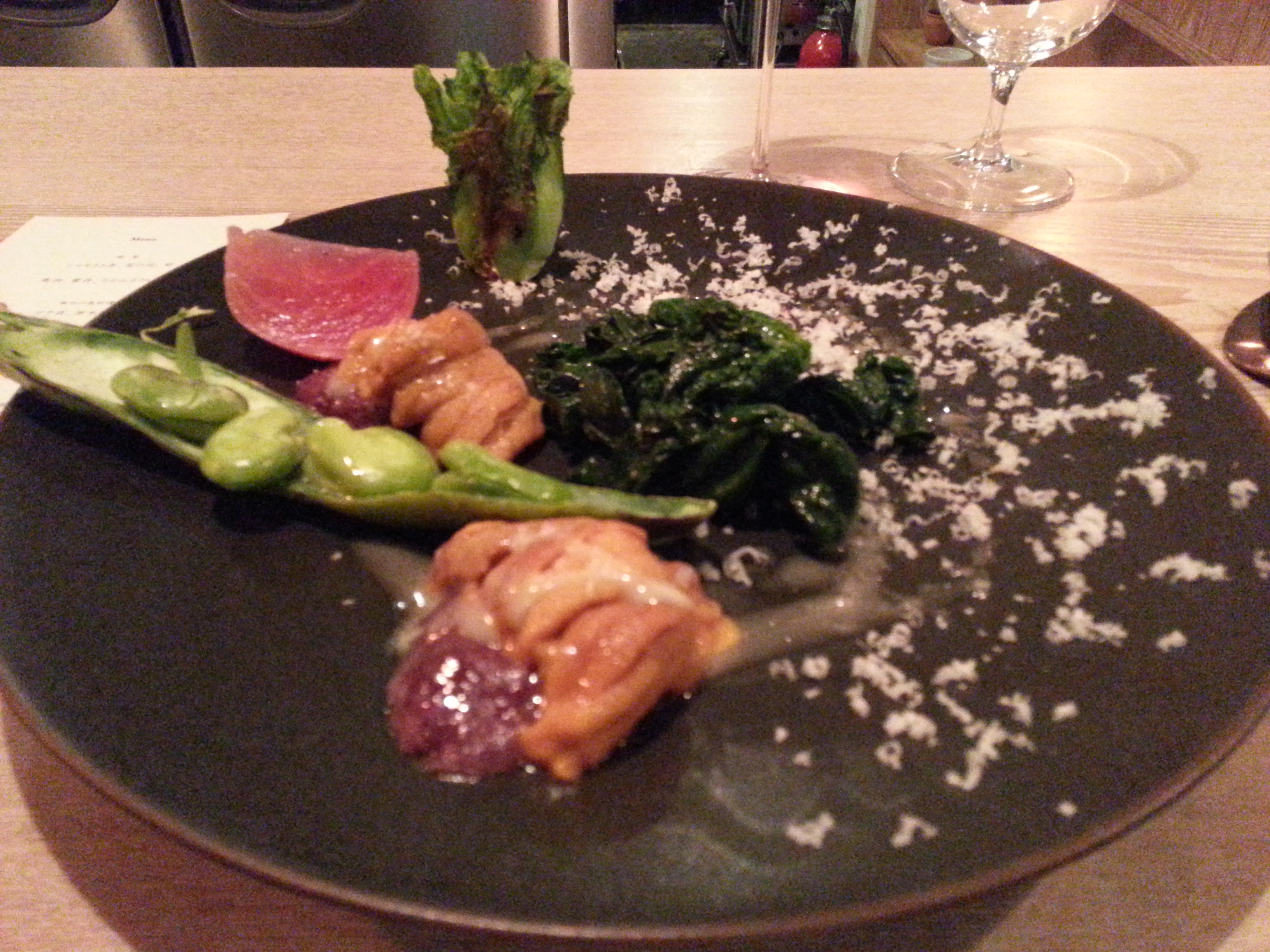 もう一品、シャモのささみと菜の花とタケノコの前菜がありました。