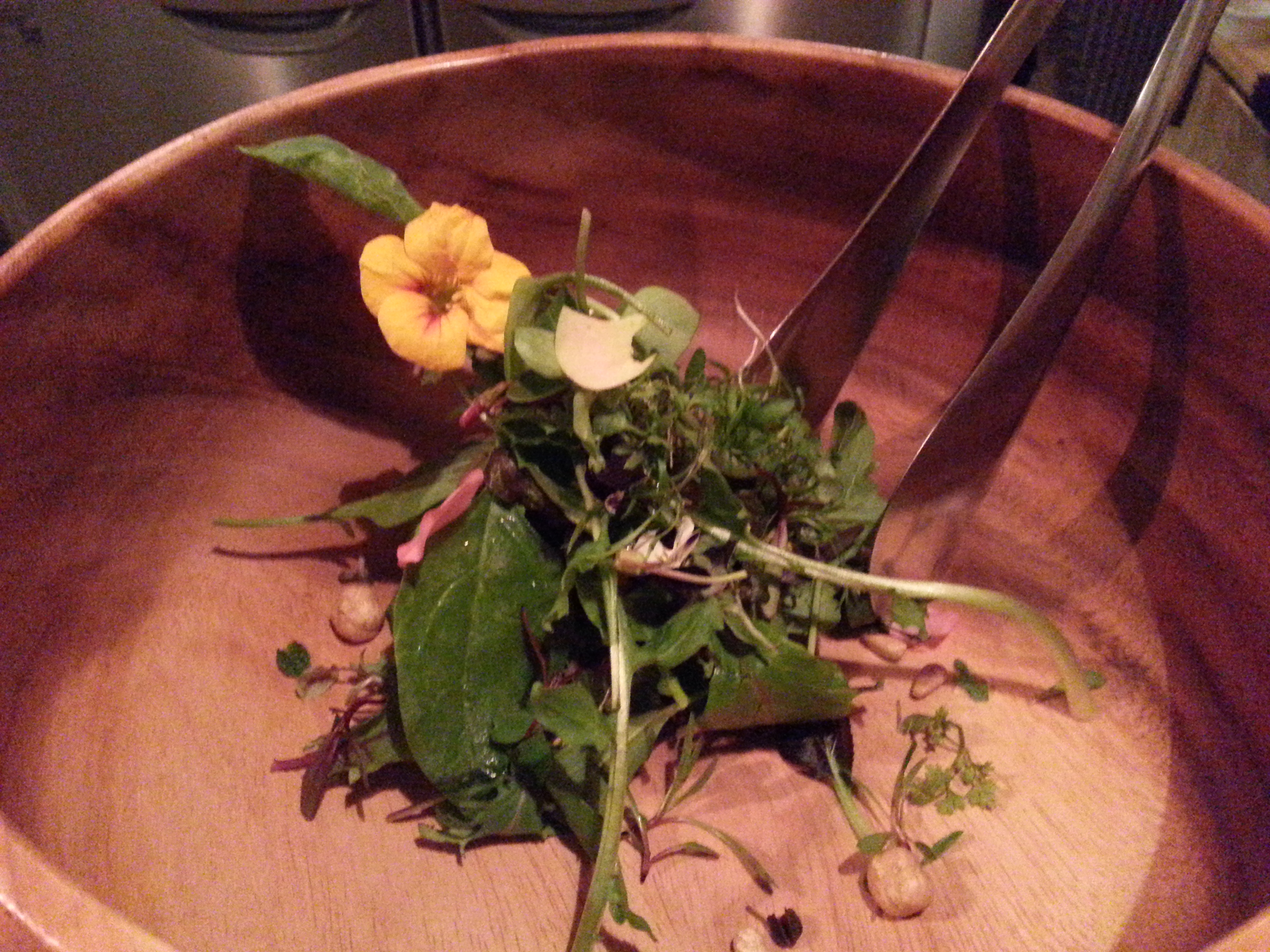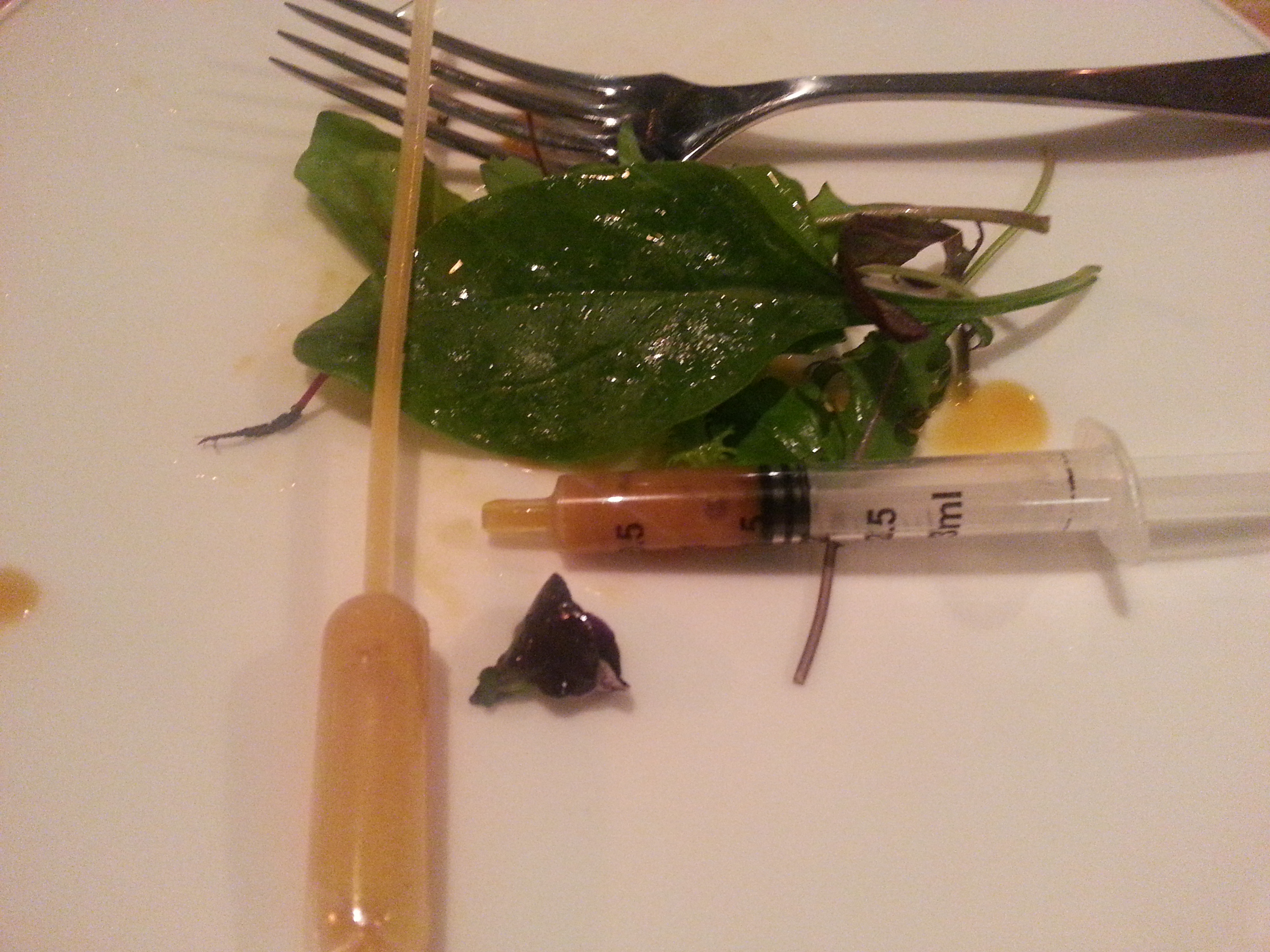 〆にサラダが出ます。ドレッシングはスポイトのようなものと注射のような容器から。