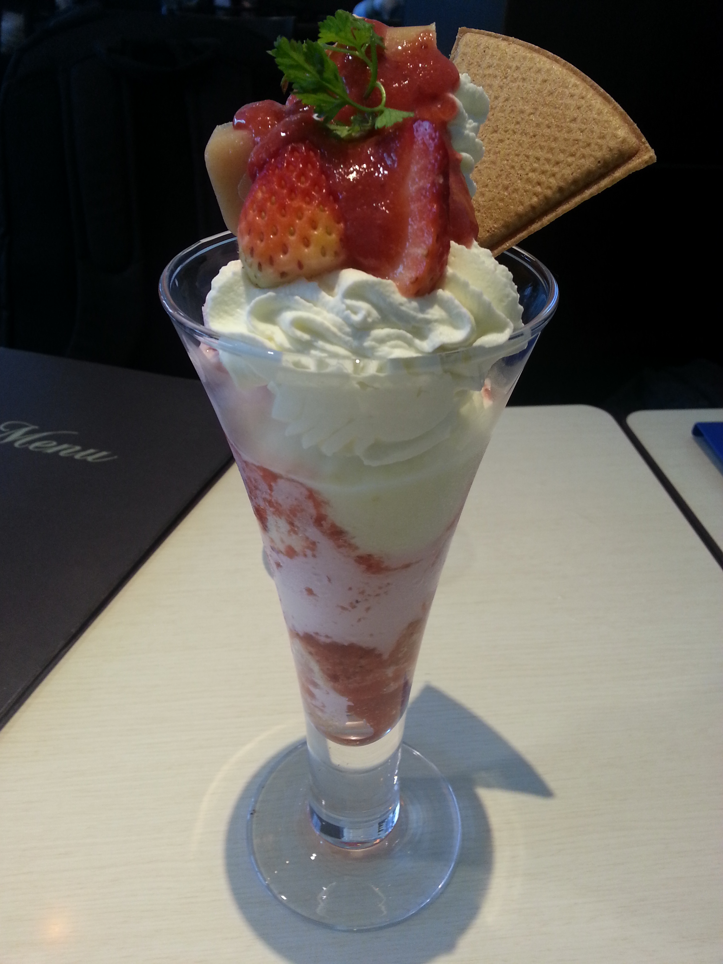 雪印パーラーのさとほろ(品種)いちごパフェ。さとほろはいちごソースで使用しているだけでいちごは他の品種のもの。