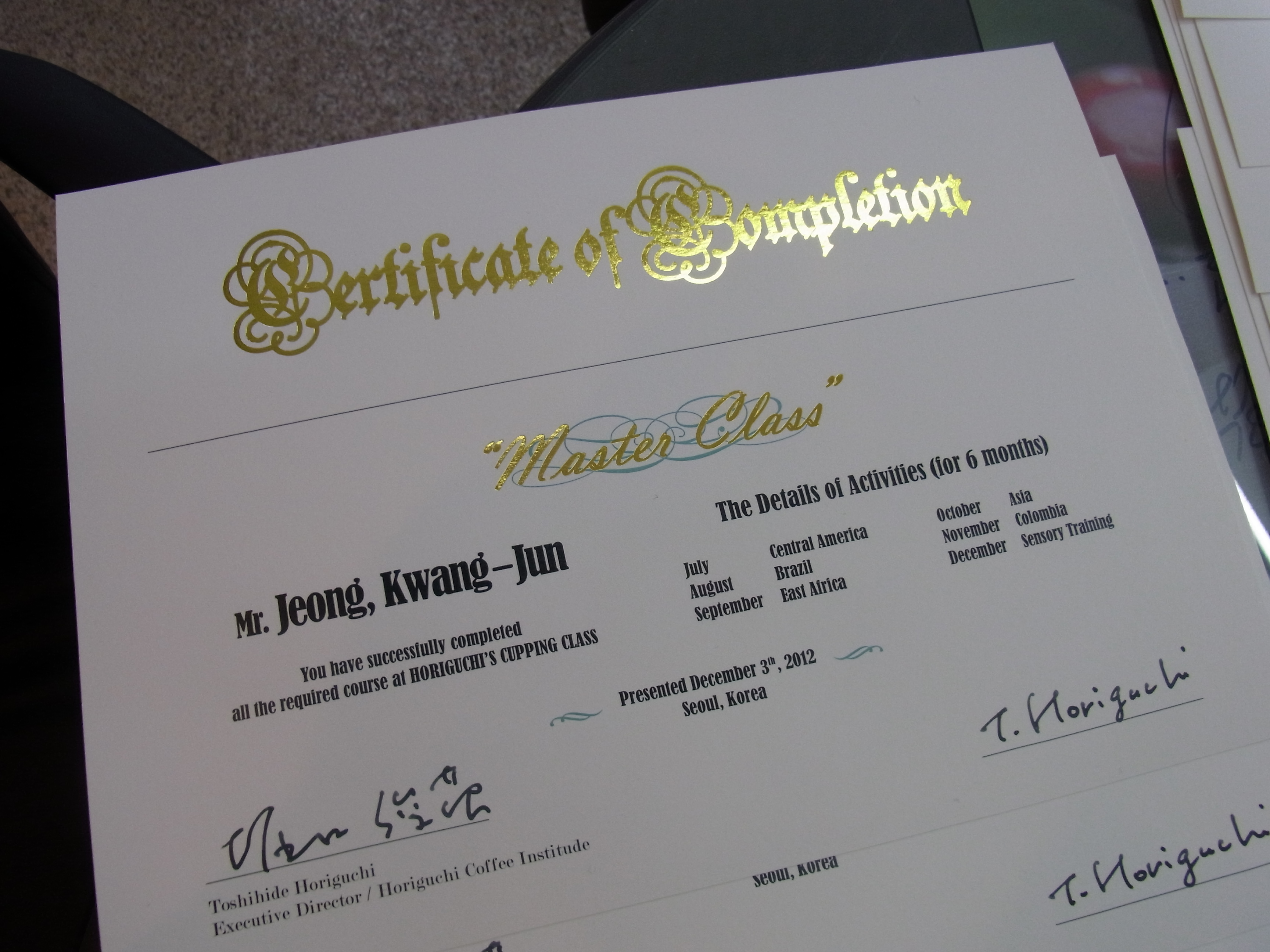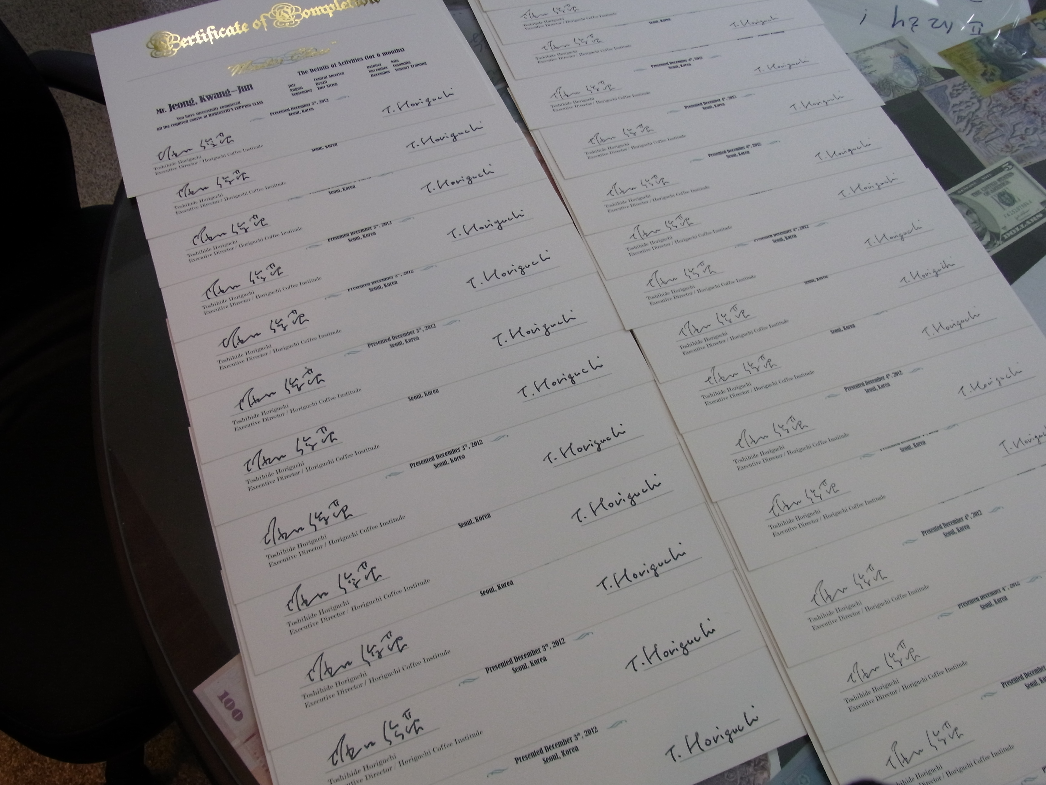 パパ日記 大雪 2012.12.7 セミナー&テースティング会 大雪のソウルから帰国。郊外の店を訪問していたので、渋滞で空港まで4時間かかった。 ソウルセミナー6か月が終了。 マスターコースはある程度実力があり、レベルは高くなった。 アドバンスコースもコーヒーの基本香味は理解できたように思える。 修了書を渡す。 カテゴリ内の一覧をみる