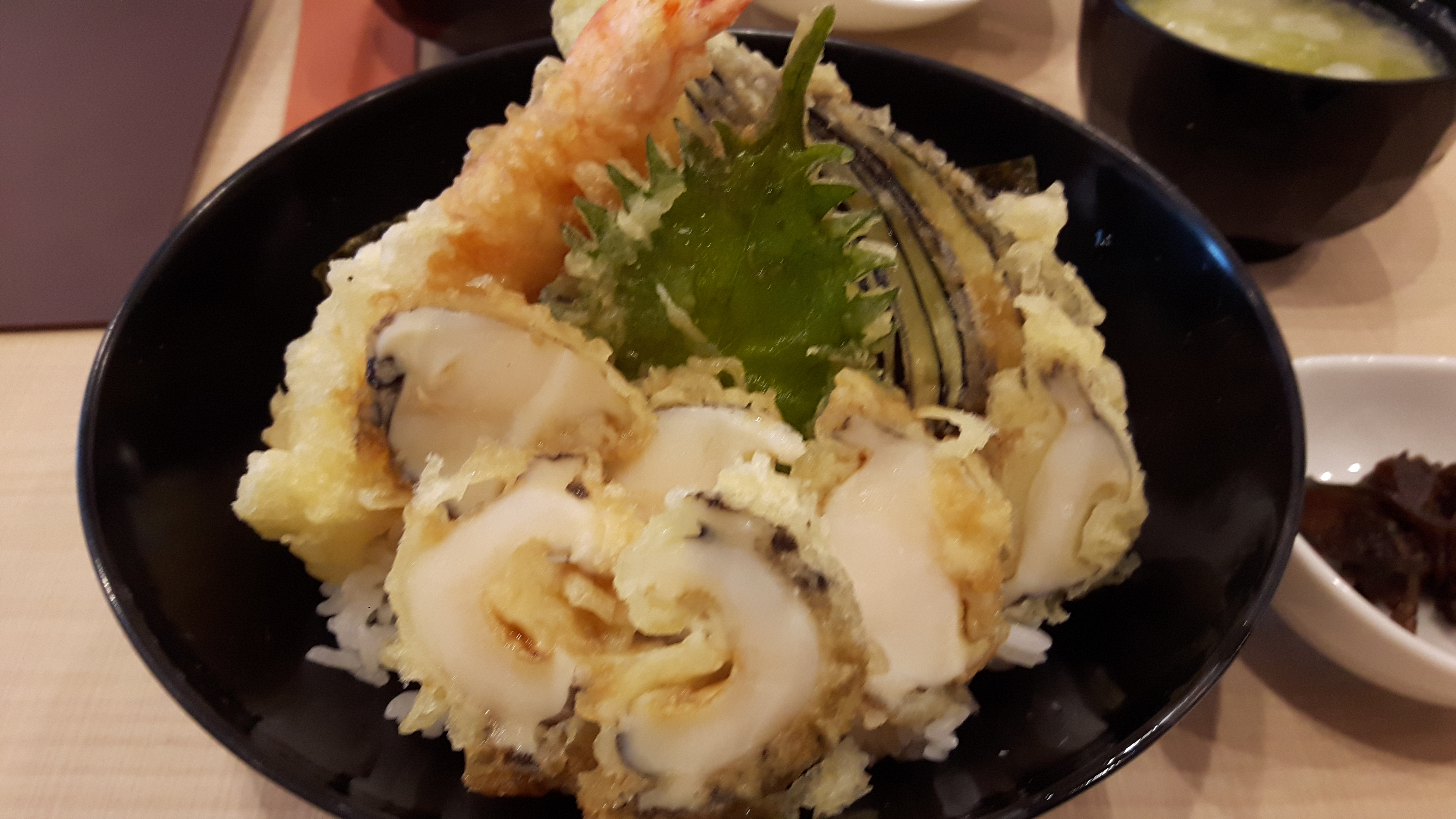 先週の土曜に虎ノ門ヒルズ周辺で昼食を食べようと思ったのですが、オフィス街ですので空いている店は少なく、それでもさまよいつつ何軒もの中から迷いながらも見つけた店のアワビの天丼です。