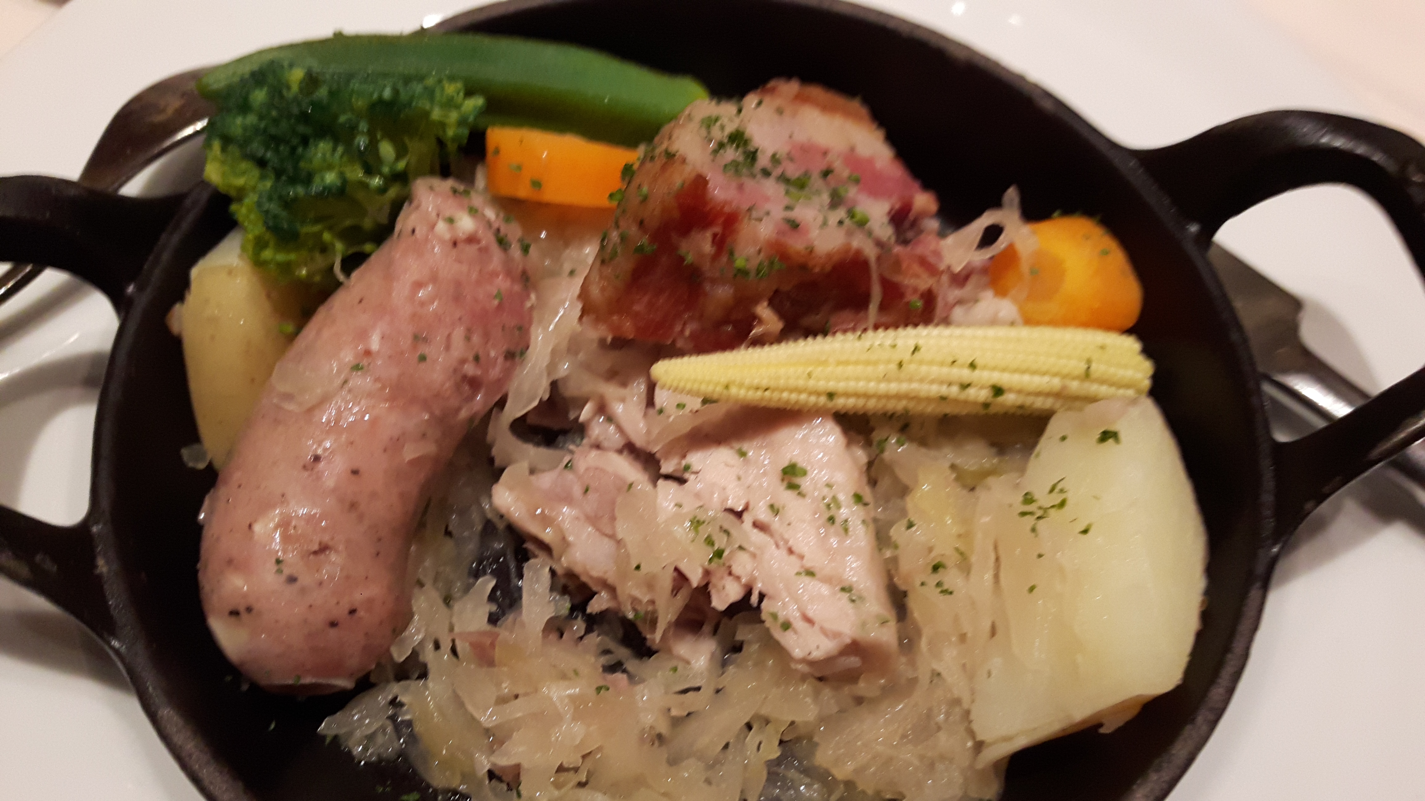 アルザス地方の郷土料理で、ザワークラウトと野菜、ハム、ソーセージなどをブイヨンで蒸し煮にするような料理。ライン川を挟んでドイツ国境と接し余すので、ドイツ料理といってもよいくらいですね。