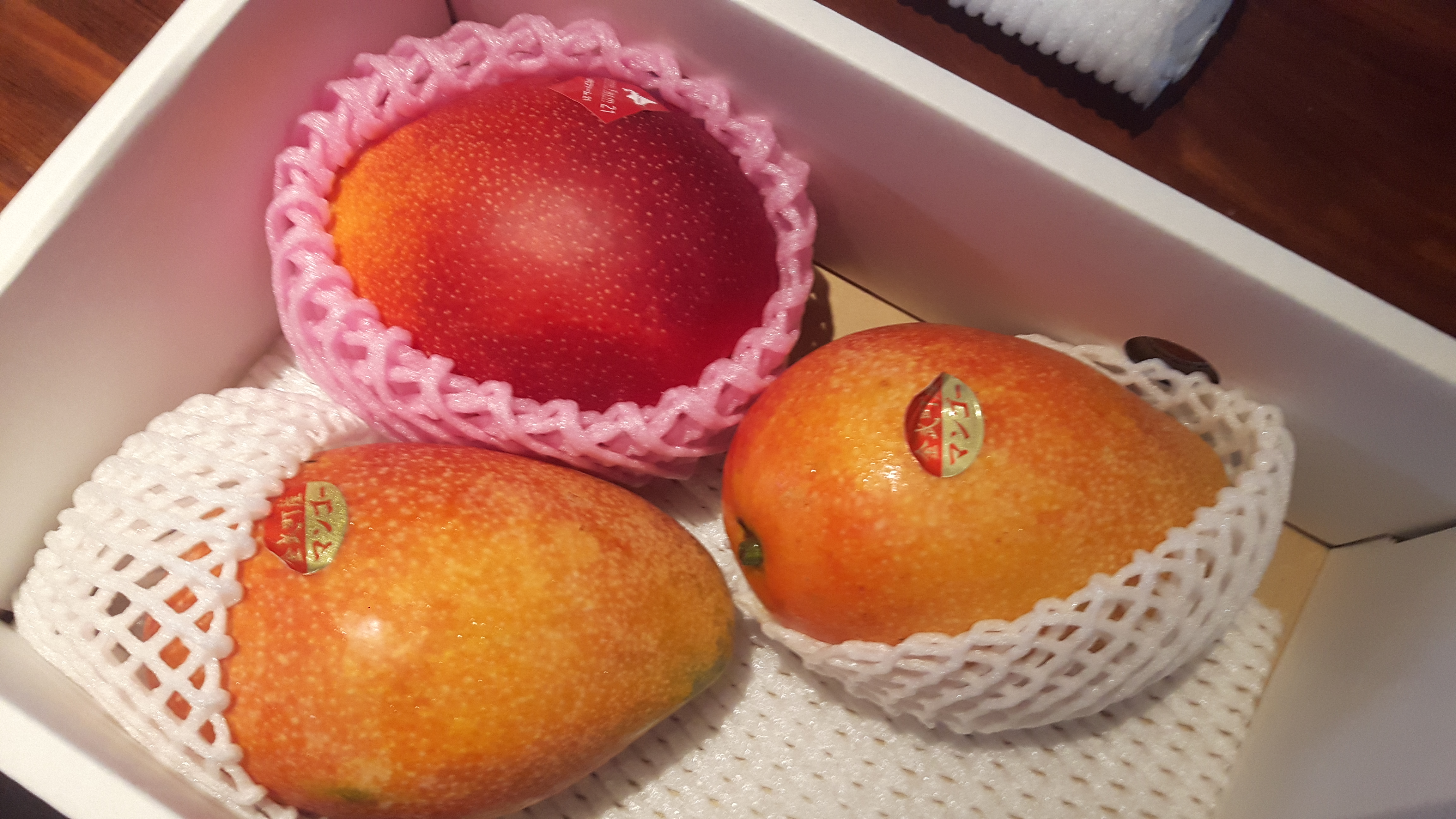 共にアップルマンゴーで赤いものは北海道産で、オレンジ色のものは沖縄産です。