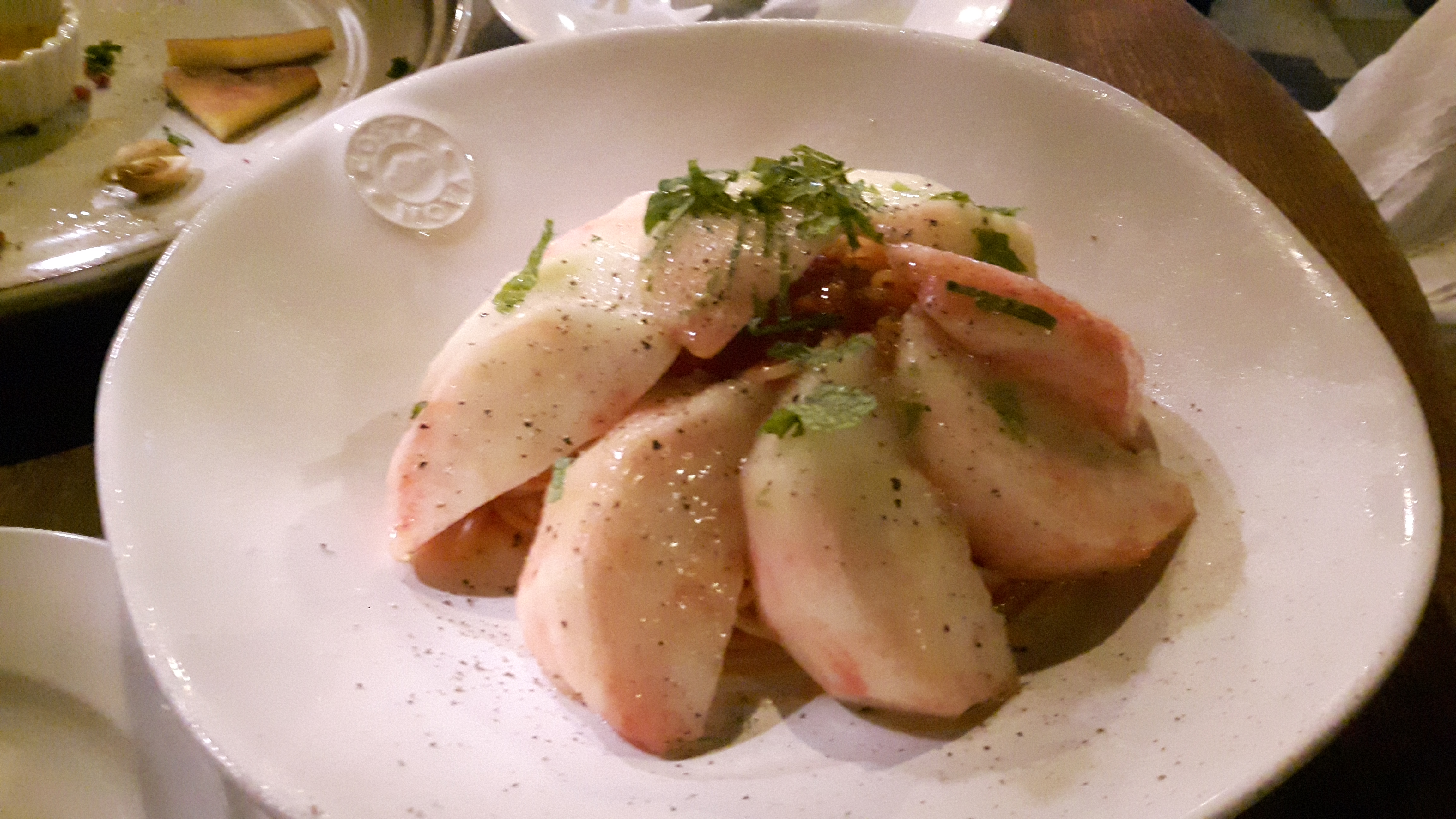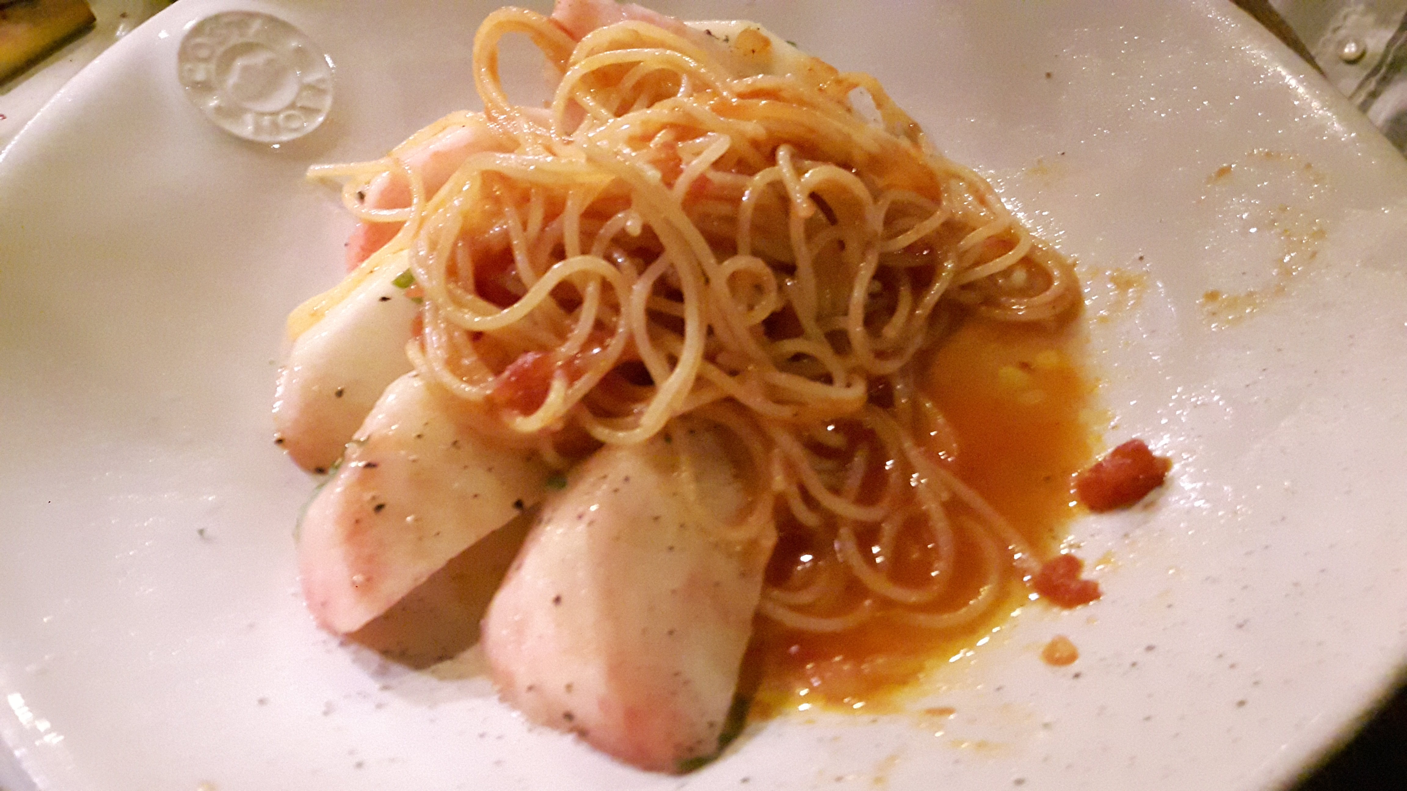 桃のスパゲティ、トマトソース味。変わっていますね。