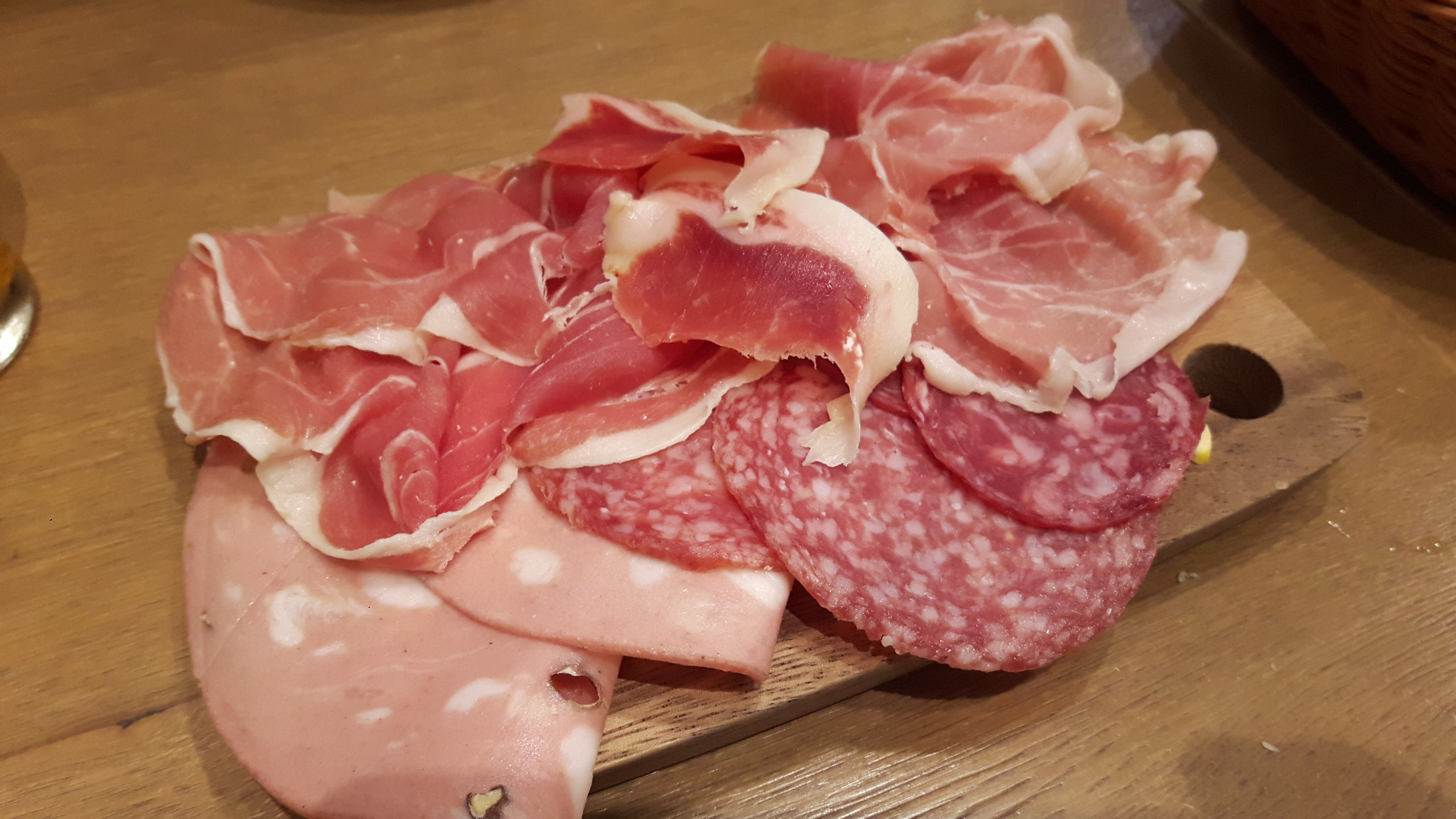 写真はイベリコ、ハモンセラーノ、パルマその他サラミなどの盛り合わせで980円と、成城石井で買うよりも安いので驚きでした。
