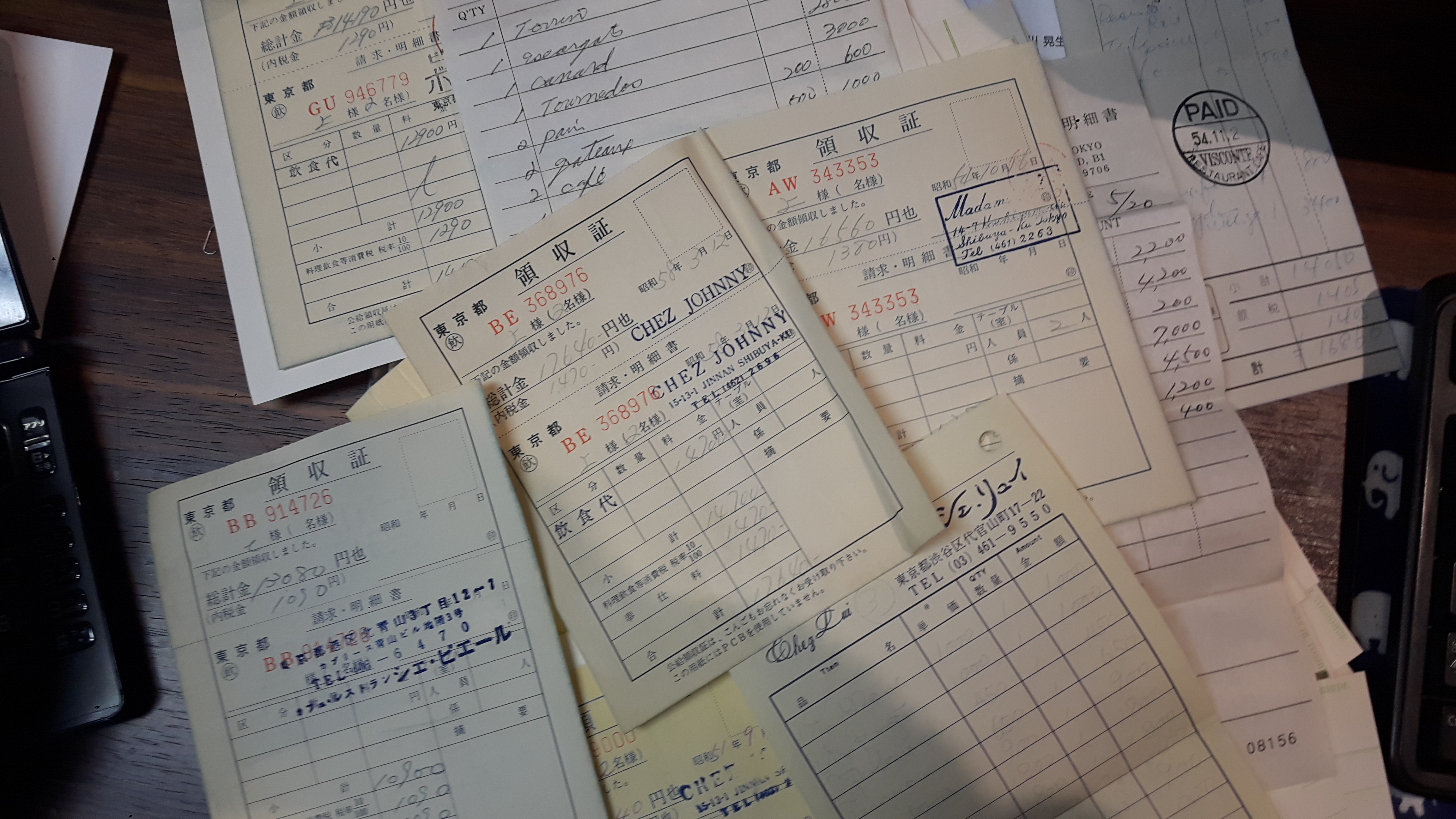 西麻布の「フィガロ」は記念すべき初めてのフレンチで、いまだにウズラの味を覚えています。ウズラって食えるのか?のような世界でした。「レストラン・プロバンス」、こんなにでかいスズキ、、、「ビストロ・デ・ラ・シテ」西麻布のビストロ創生期を代表する店、、、「ビストロサンノー」赤坂のビストロの元祖のような店、、、「イルドフランス」青山の旧ドンクの地下にあった、、、、「ムスタッシュ」など、今は亡きなつかしい幻の名前が領収書から出てきます。