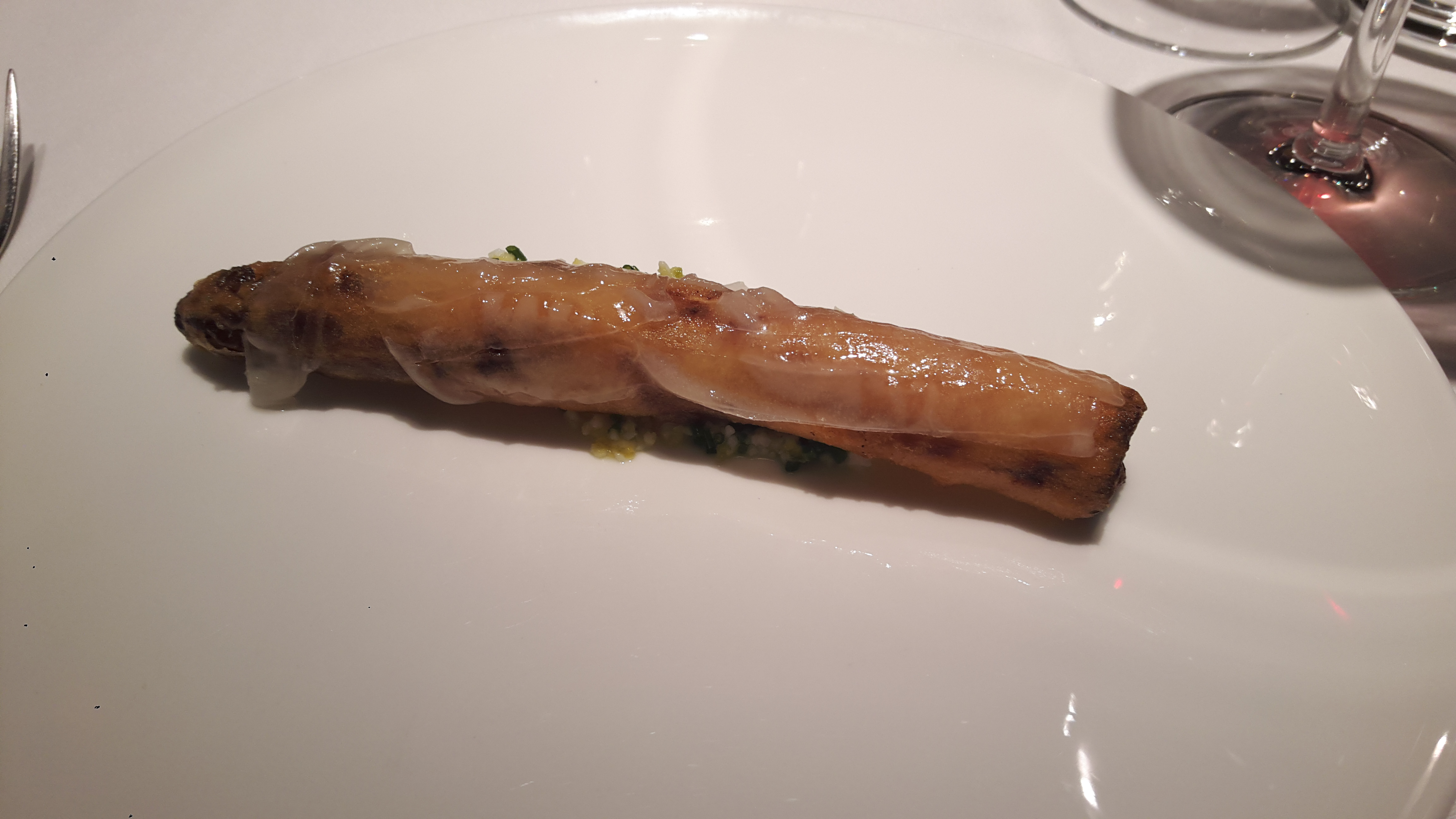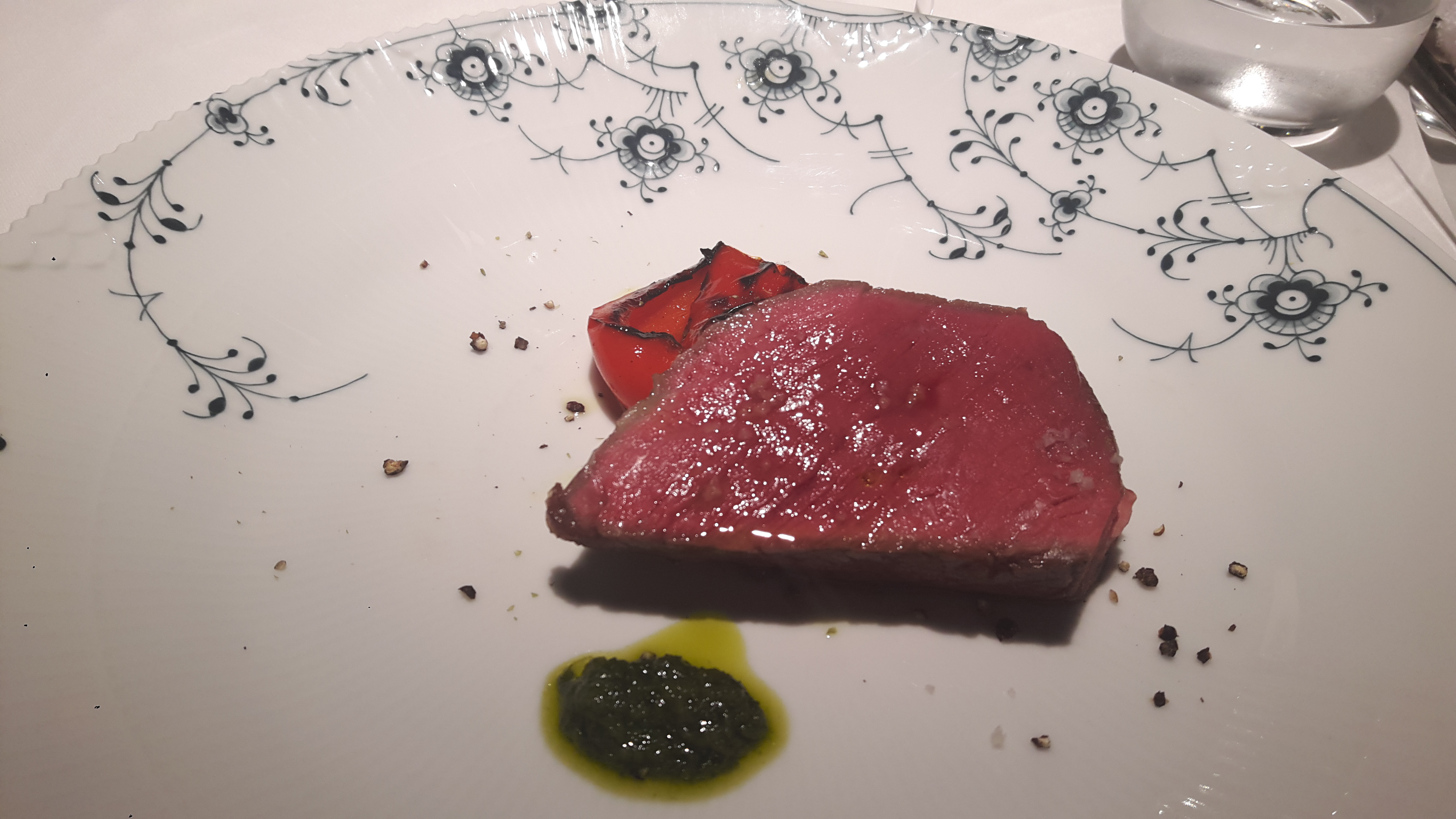 フランスのホワイトアスパラのフリット、北海道の白老牛の赤身。