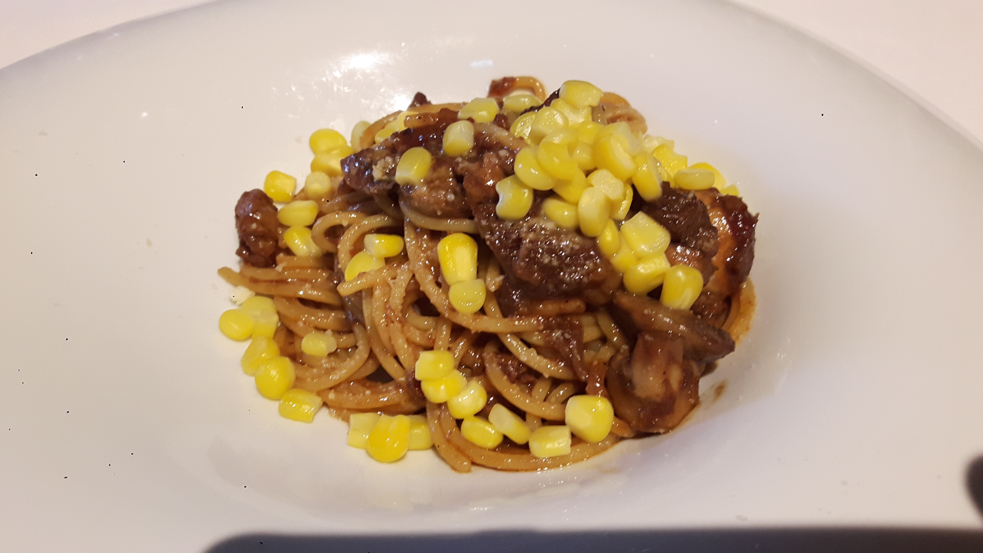 ボローニャのスパゲティは、牛肉の赤ワイン煮をほぐしたような具でイタリアンぽい味では有りませんし、味が濃すぎました。お子様向けのトウモロコシをトッピングしてもらいました。