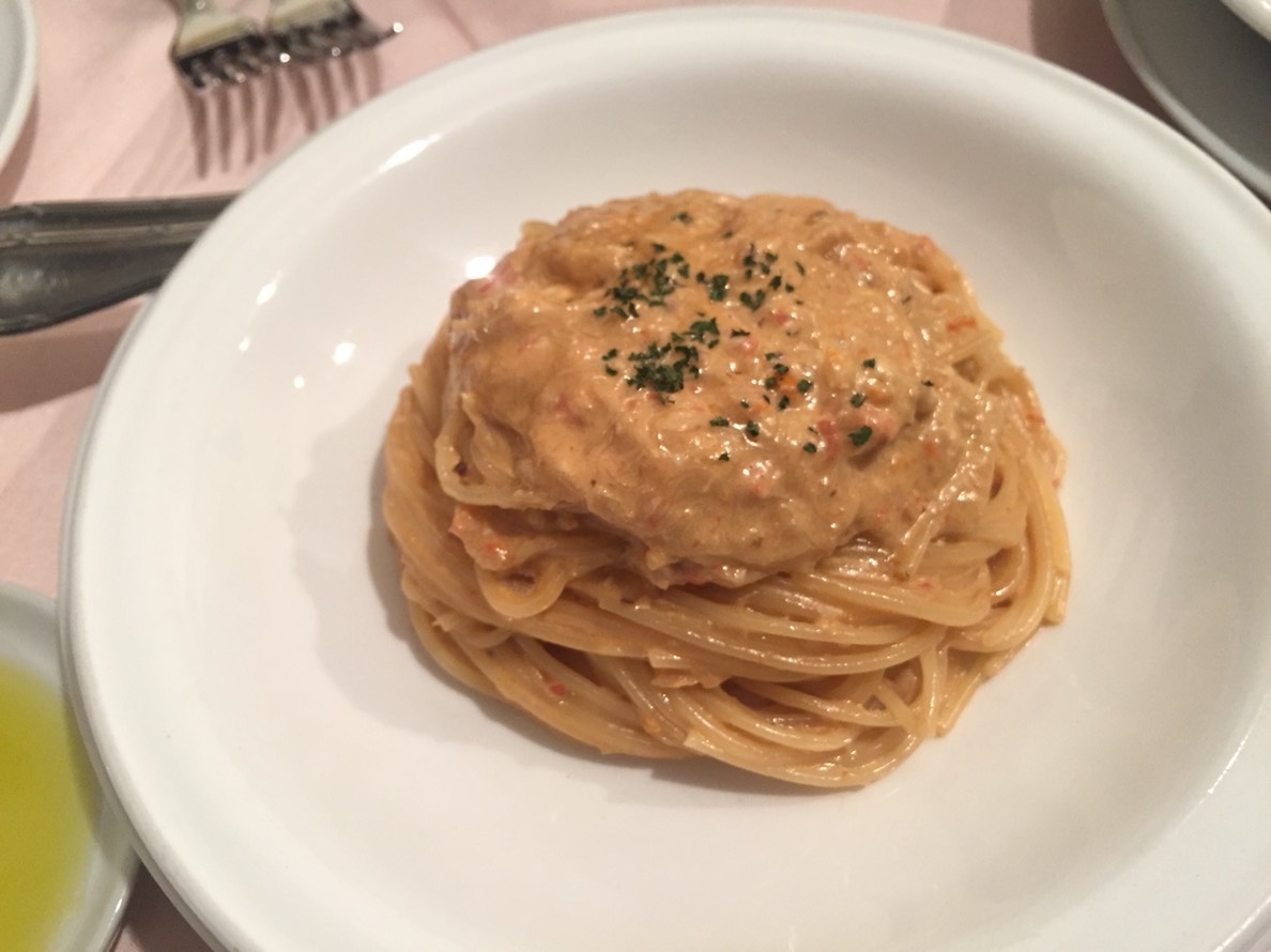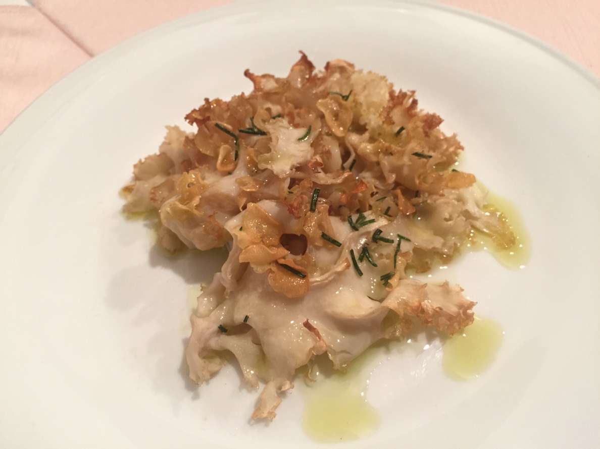 信州のキノコ、ズワイガニのスパゲティ、エビ。